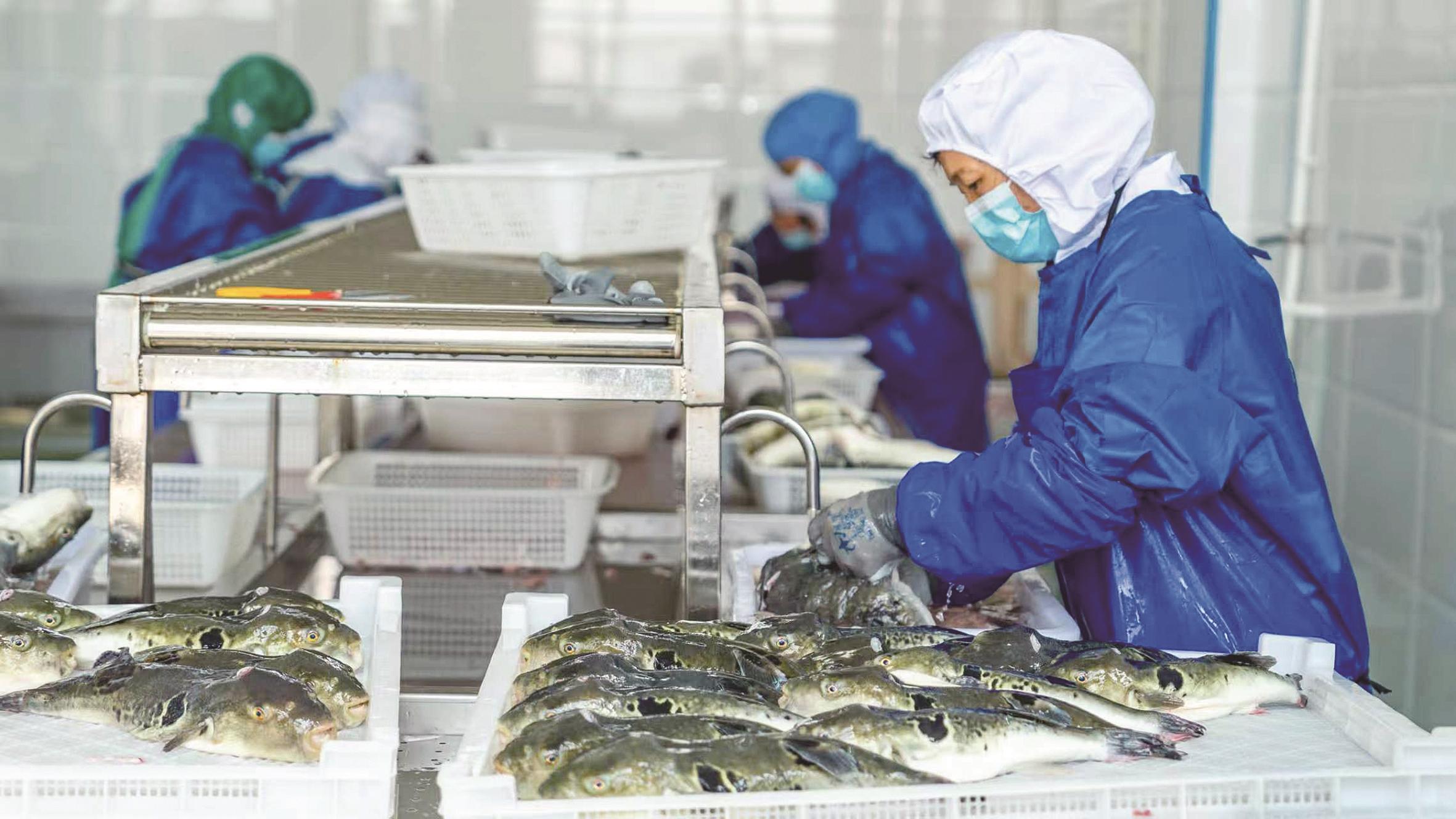 产业链的延伸让河豚实现“全身都是宝”。在深加工车间,工人将河豚鱼皮制成鱼皮丝,鱼肉被分成刺身级、加工级,就连鱼骨都熬成了高汤。“以前扔了的鱼内脏,现在成了生物饵料的原料。”