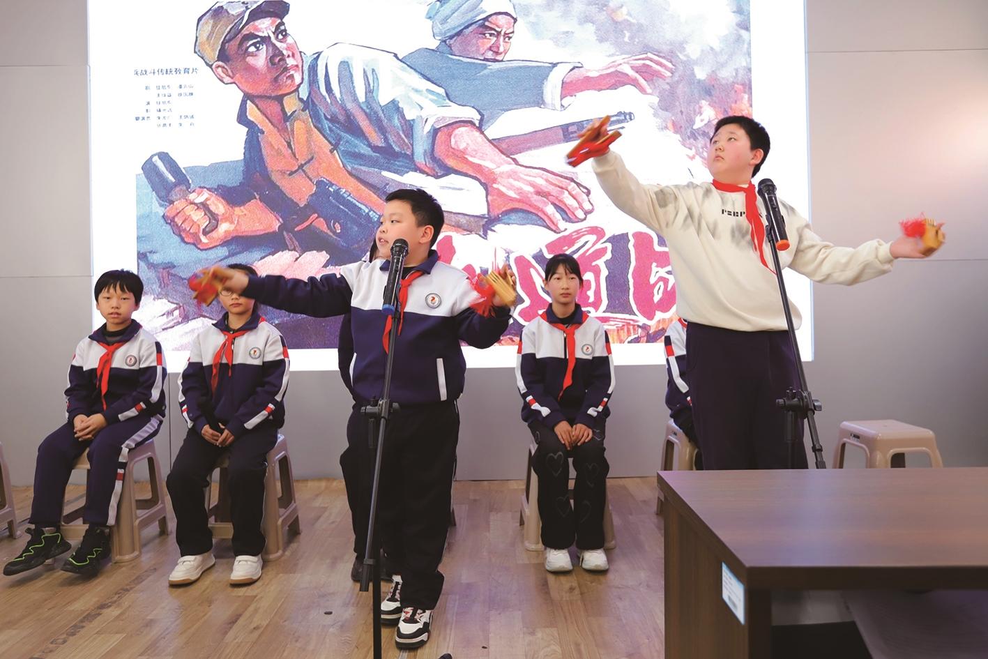 特邀嘉宾“中国好人”、河北省非物质文化遗产代表性项目“冀东段派评书”传承人唐建文结合非遗传承经历,鼓励同学们将快板、皮影等传统技艺与红色故事结合,用创新形式传递爱国情怀,并向全校少先队员发出"观影学党史、强国勇担当"的倡议,希望大家在观影中读懂历史、在实践中传承精神。