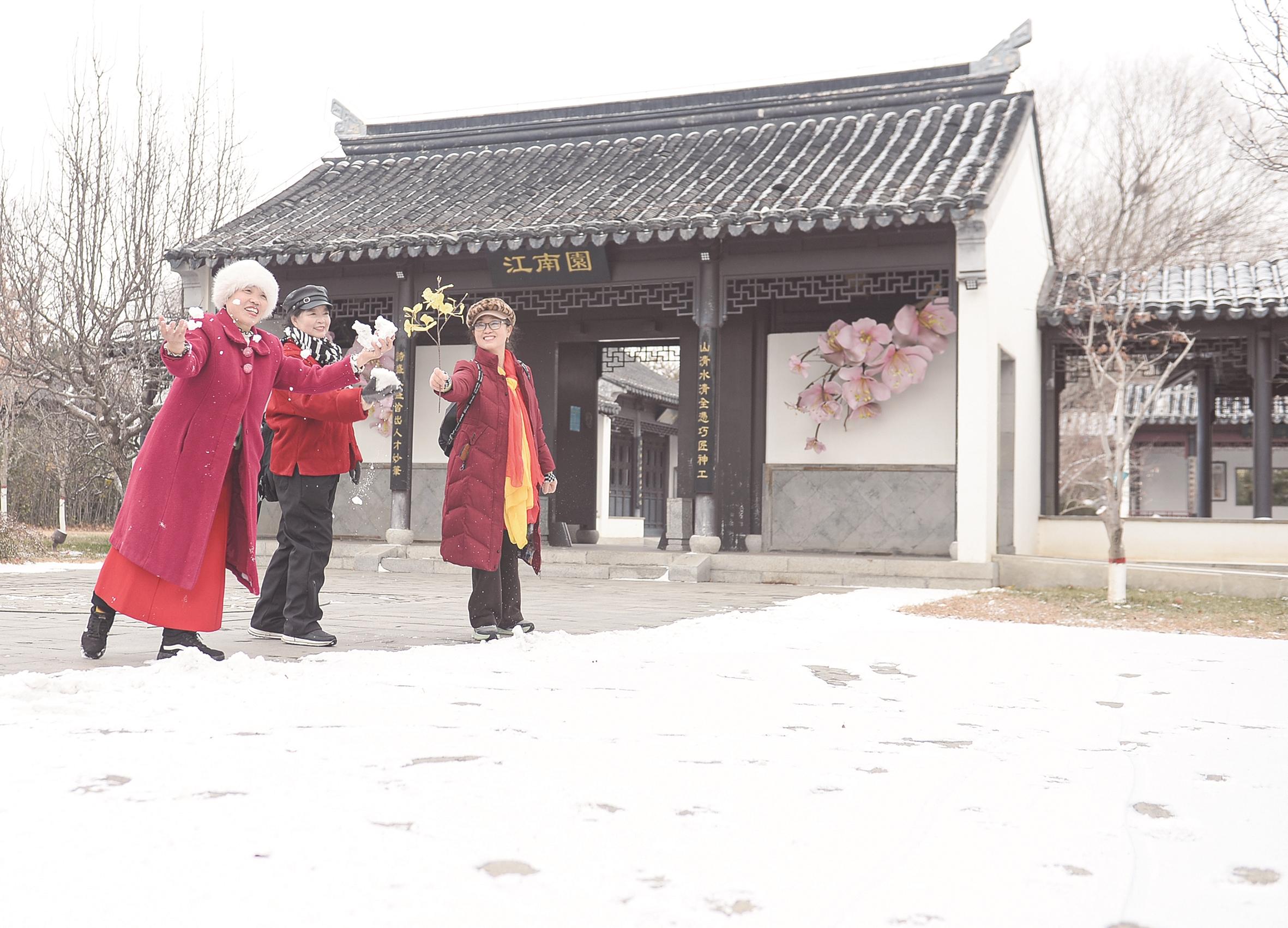 图为唐山南湖·开滦旅游景区内青瓦白墙覆上雪花更添雅致,游客尽赏美景。