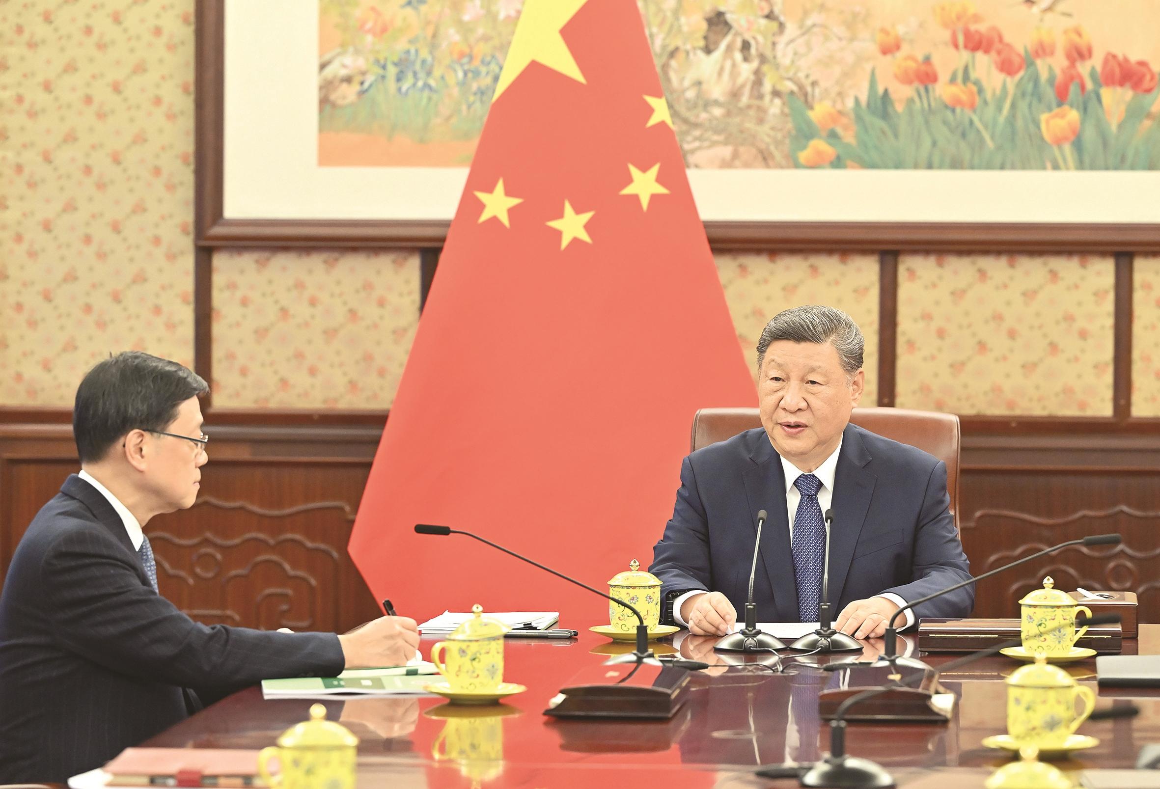 习近平表示,一年来,李家超行政长官带领特别行政区政府,勇于担当、积极进取,坚定维护国家主权、安全、发展利益,成功举行香港第八届立法会选举,实现经济稳步增长,香港由治及兴迈出新步伐。中央对李家超行政长官和特别行政区政府的工作是充分肯定的。