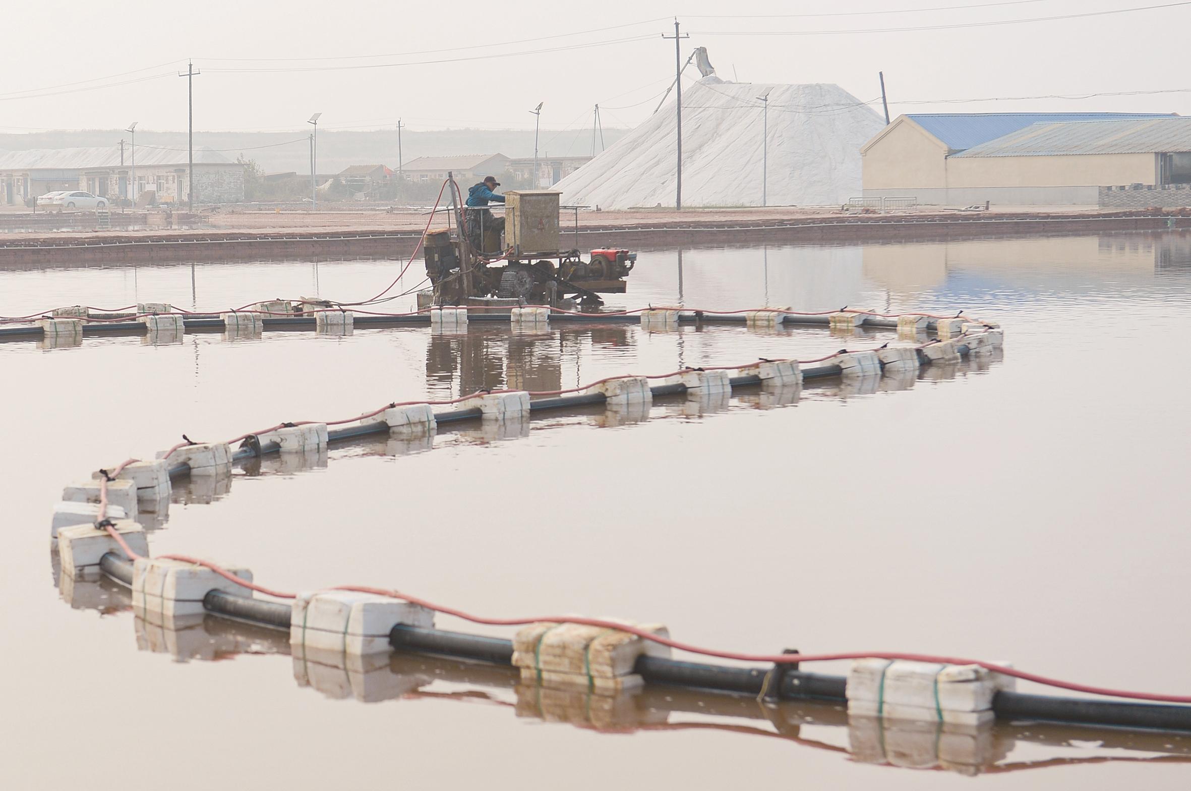绿色发展的理念,也贯穿在产业链的每一环。在河北南堡盐场有限公司第五盐场,26座小山一样的洁白盐堆矗立在盐场坨地上,在盐堆旁的结晶卤水池里,一体化扒盐机正在作业,一条200多米的黑色管子从结晶卤水池里延伸到盐堆的顶部。“管道里是原盐晶体和饱和卤水的混合物,经过接力加压,送到盐堆上。”盐场负责人董斌对记者介绍,“我们五盐场年生产工业原盐22万吨。” 河北南堡盐场有限公司位于唐山市曹妃甸区南堡经济开发区,占地340254亩,所属行业为采盐业,是长芦盐区的海盐生产基地之一。主要产品为原盐和化工产品溴素,其中原盐主要销售给三友集团,成为盐化工产业优质原料。 三友蓝海科技公司则“变废为宝”,通过浓海水综合利用,可解决钢铁、化工产业的供水问题,又保障了区域水资源安全。
