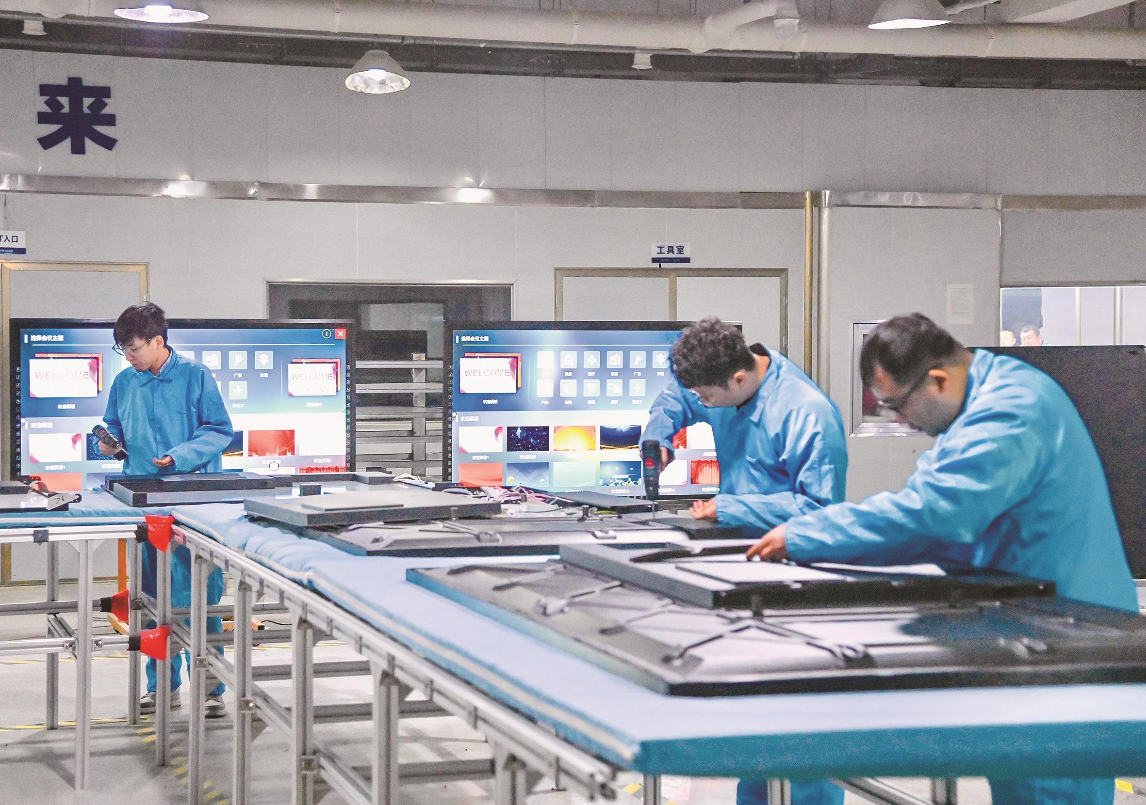 图为工作人员正在组装智能教学一体机。