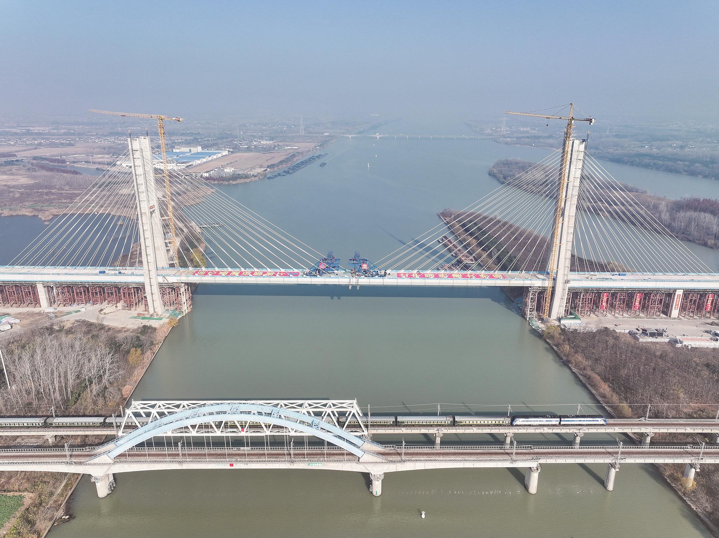 12月19日,由中国铁建大桥局承建的沪渝蓉高铁通泰扬特大桥跨京杭运河斜拉桥顺利合龙,通泰扬特大桥控制性工程取得突破性进展。本次合龙的跨京杭运河斜拉桥位于江苏扬州,全长564.3米,主跨300米,主塔高128米,桥面距离航道水位约30米。
