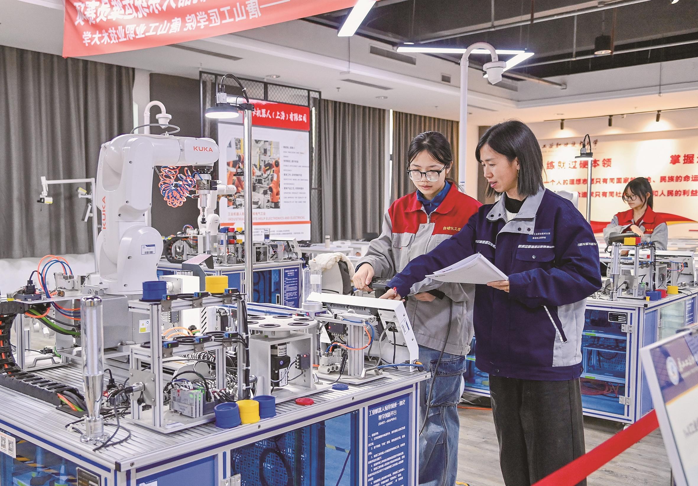 图为教师指导学生开展工业机器人技术相关实训。