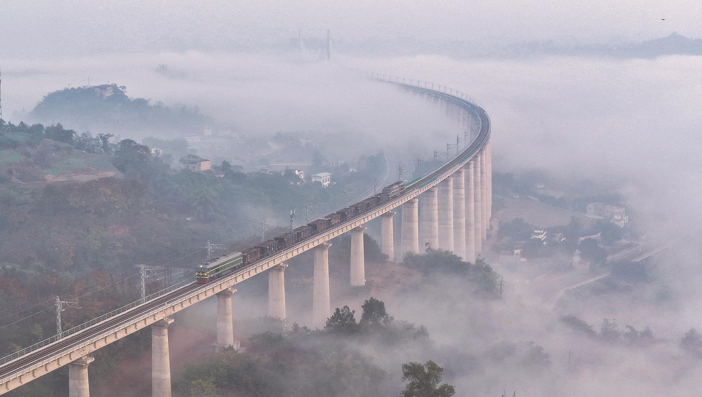 12月8日,一列试验列车行驶在四川省泸州市境内的隆泸叙铁路上(无人机照片)。