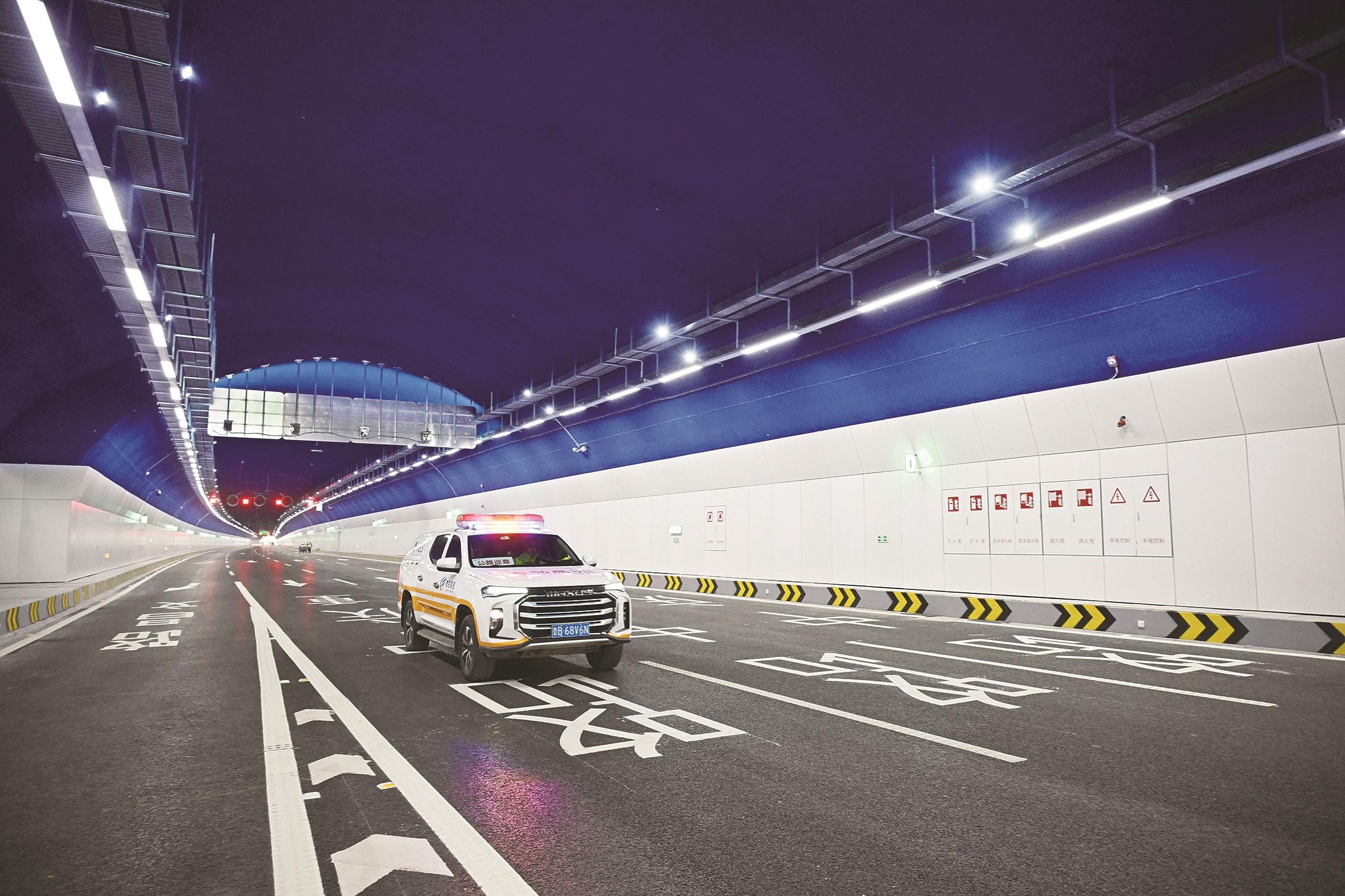12月26日,一辆高速公路巡查车在老虎山隧道内行驶。