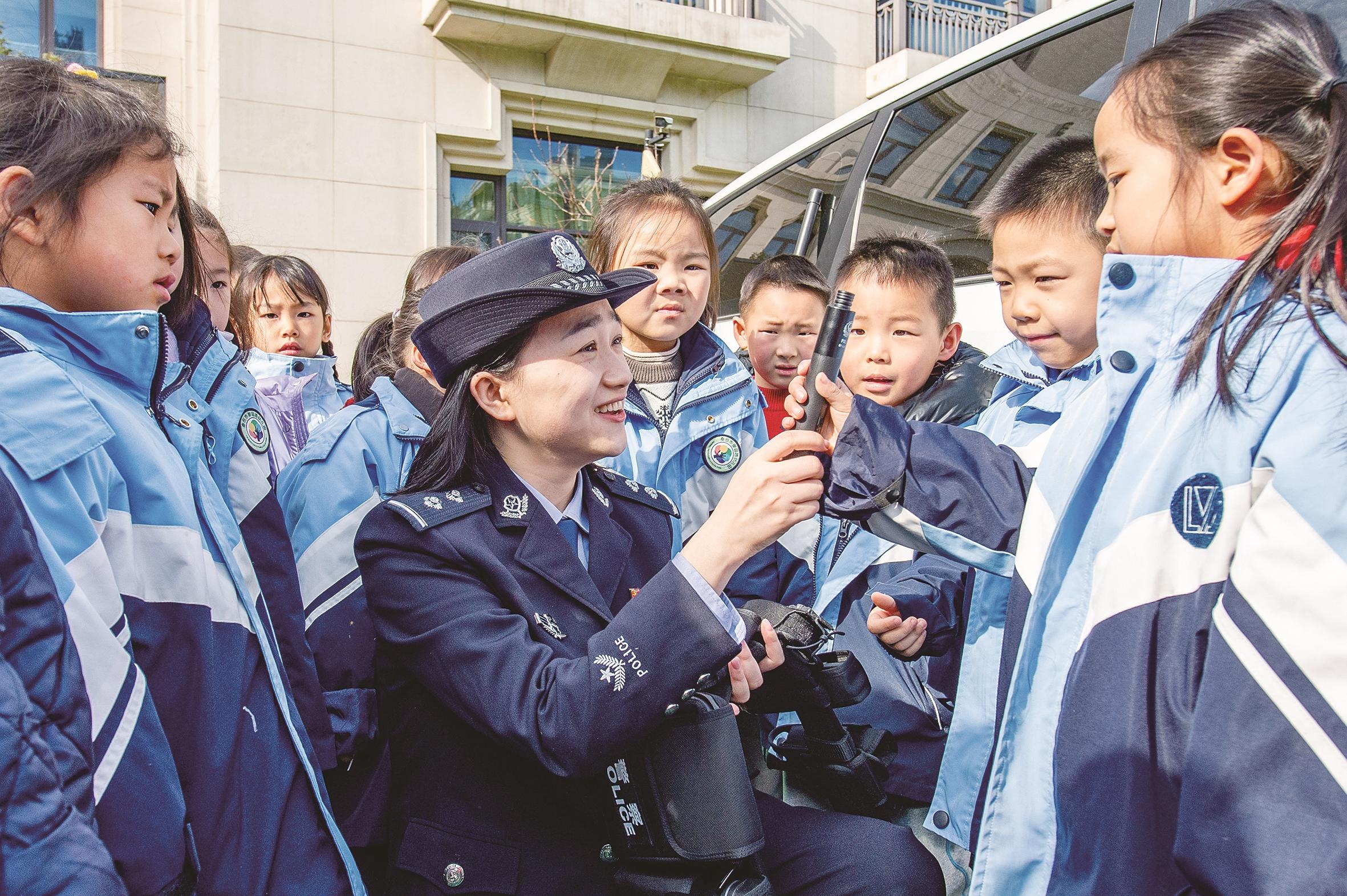 1月9日,在江苏省泰州市御园路幼儿园,泰州市公安局泰州医药高新区分局凤凰派出所民警给小朋友介绍警用装备。