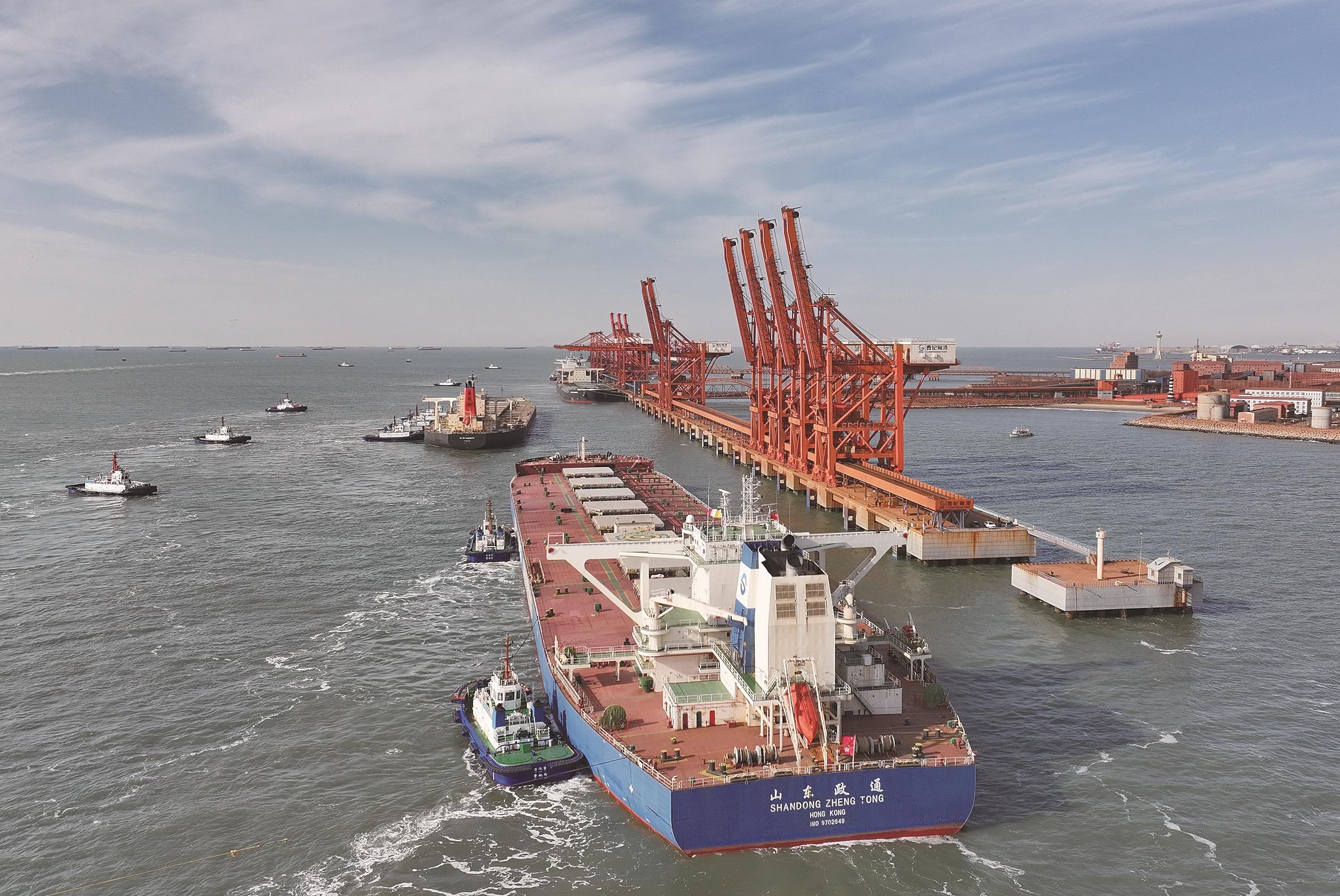1月13日,两艘轮船在拖轮协助下向唐山港曹妃甸港区矿石码头靠泊(无人机照片)。