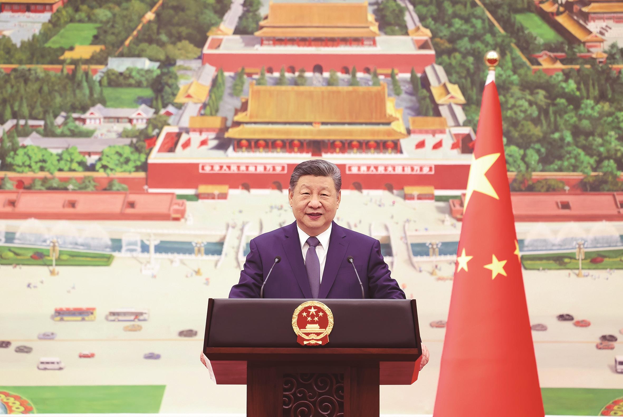 习近平指出,今天的世界,百年变局加速演进,国际形势变乱交织,全球性挑战更加突出。分裂对抗、零和博弈注定没有出路,让世界重回丛林法则不得人心,同球共济、团结合作才是唯一正确选择。我提出全球治理倡议,旨在推动构建更加公正合理的全球治理体系。中国将始终站在历史正确一边,以人民之心为心、以天下之利为利,同各国一道推动构建人类命运共同体。