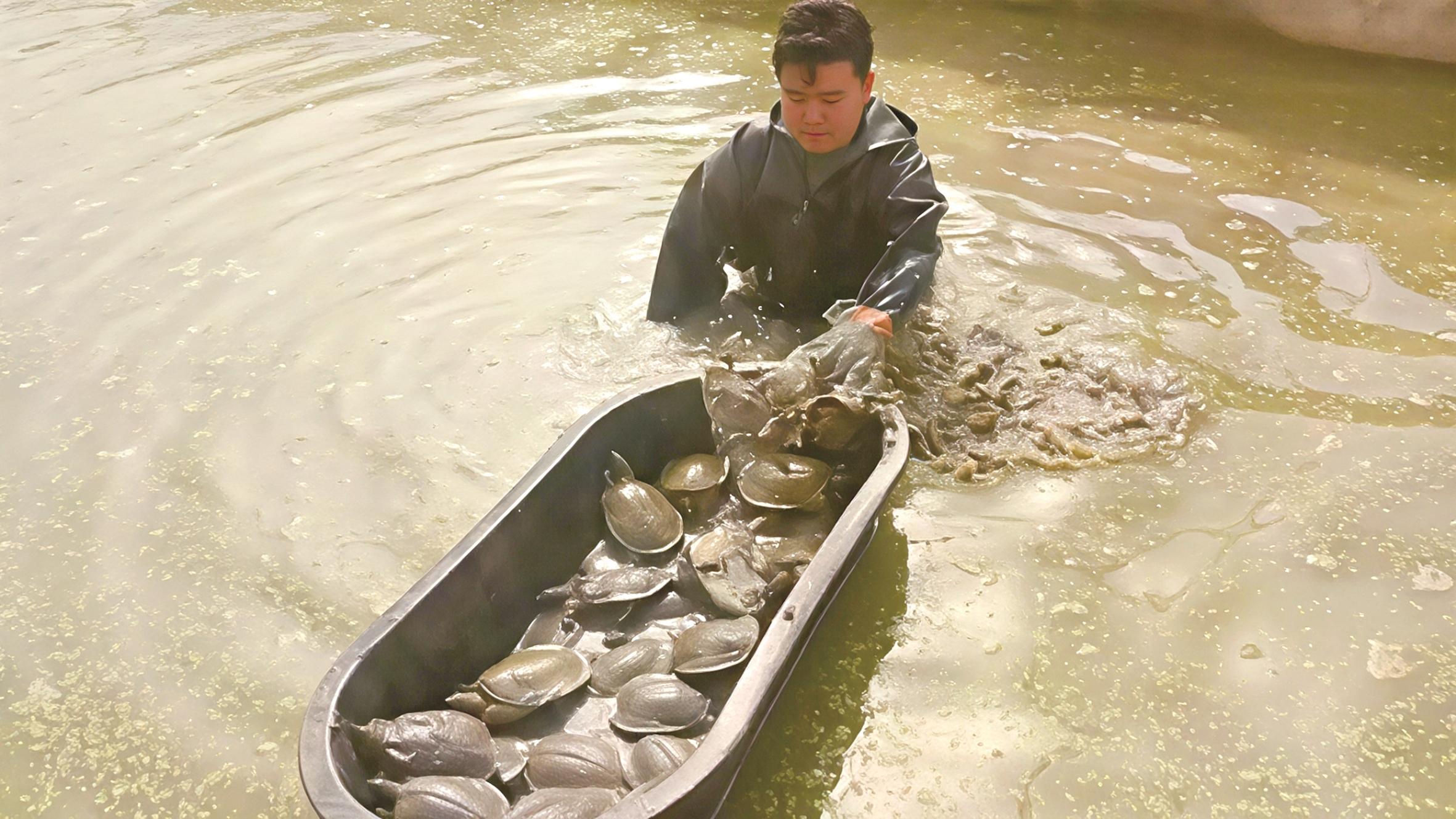 “那时水性好的村民,河里随便一捞就是四五斤的野生甲鱼,谁也没料到这‘水中宝贝’会成为致富密码。”宋学飞介绍,2005年,受父亲影响,他踏上甲鱼养殖创业路。最初的两个简易养殖池,成了他摸索技术的“试验田”。从水温调控、饲料搭配,到疫病预防、人工孵化,他日夜守在养殖棚,逐渐摸透甲鱼生长习性。“甲鱼性子娇贵,水温差1摄氏度就影响生长,单孵化环节就试了上百次,才掌握恒温恒湿诀窍。”2008年,宋学飞牵头成立鑫龙养殖专业合作社,将分散养殖户凝聚起来,实现统一品种、标准与销售,让玉田甲鱼从“单打独斗”迈向“抱团发展”。