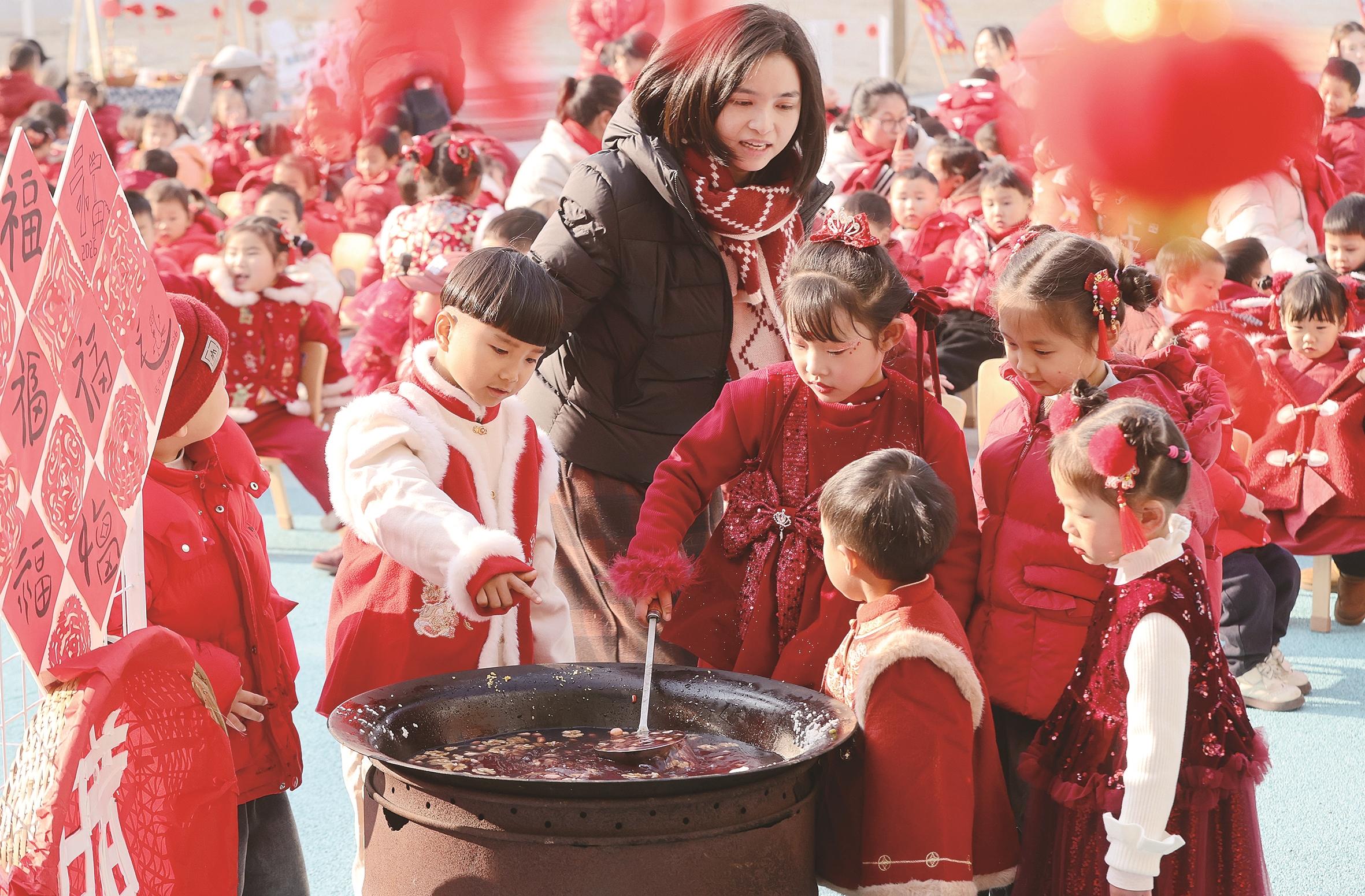 1月23日,在浙江省湖州市德清县新市镇第三幼儿园,小朋友体验煮腊八粥。