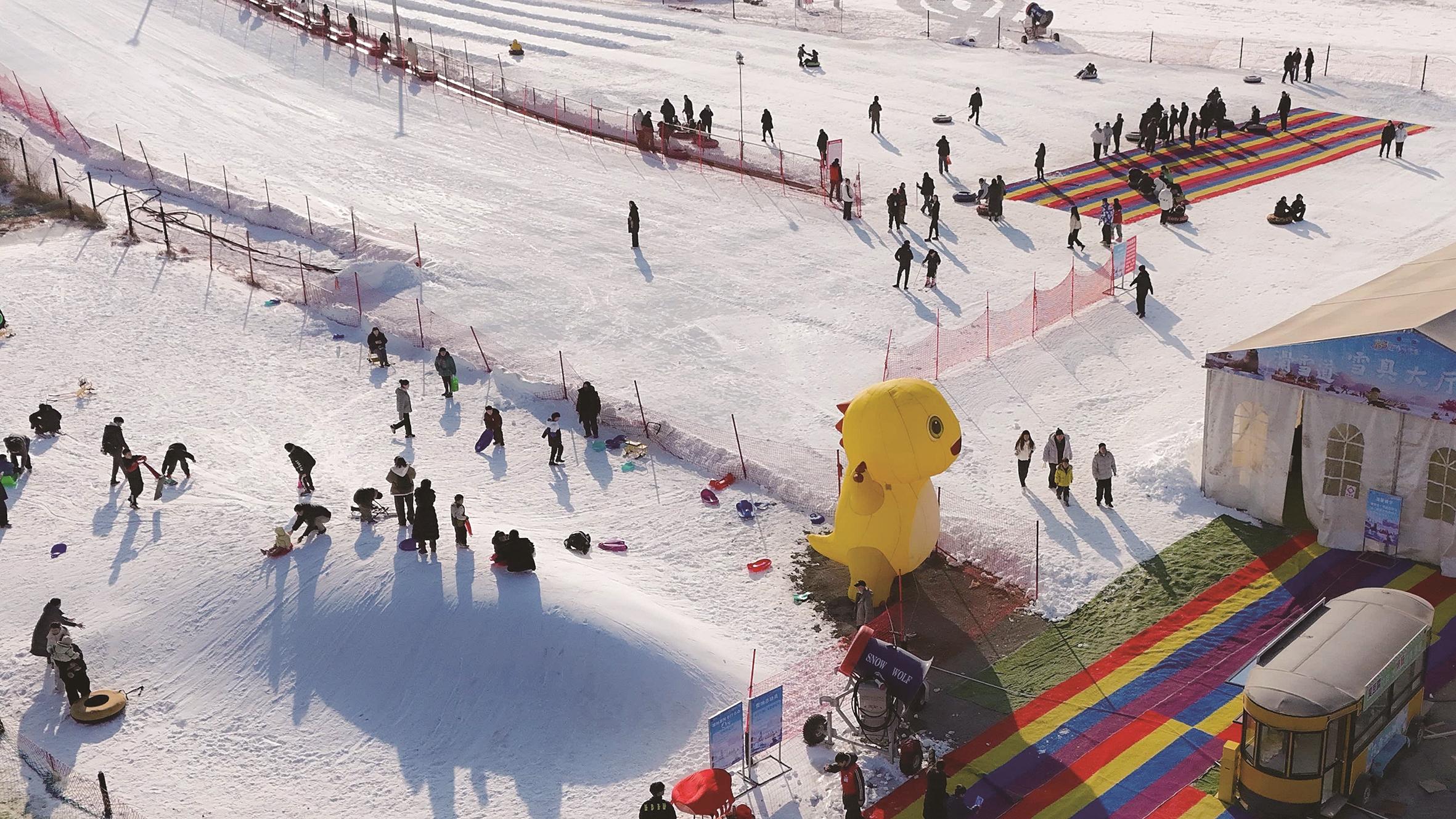 活动现场,数个5米多高的糖葫芦组成的景观格外抢眼,穿上大花袄的巨型冰嘎景观与皑皑白雪形成鲜明对比,游客们或与巨型冰嘎合影,或模仿打冰嘎的动作定格趣味瞬间。雪上乐园区域里,游客们体验着无动力摩托车、雪地大陀螺、雪地碰撞球等趣味项目,分享亲子欢乐时光。滑雪运动区内,游客从雪道上飞驰而下,感受冰雪滑行的速度与激情。嘻哈冰场上,游客们呼朋引伴,玩转冰上爬犁、冰上陀螺、冰上不倒翁及各类冰车等无动力设备,尽情享受冰上乐趣。在极地海洋村,游客们钻进极地雪屋,与因纽特NPC互动留影,感受新奇的异域风情……