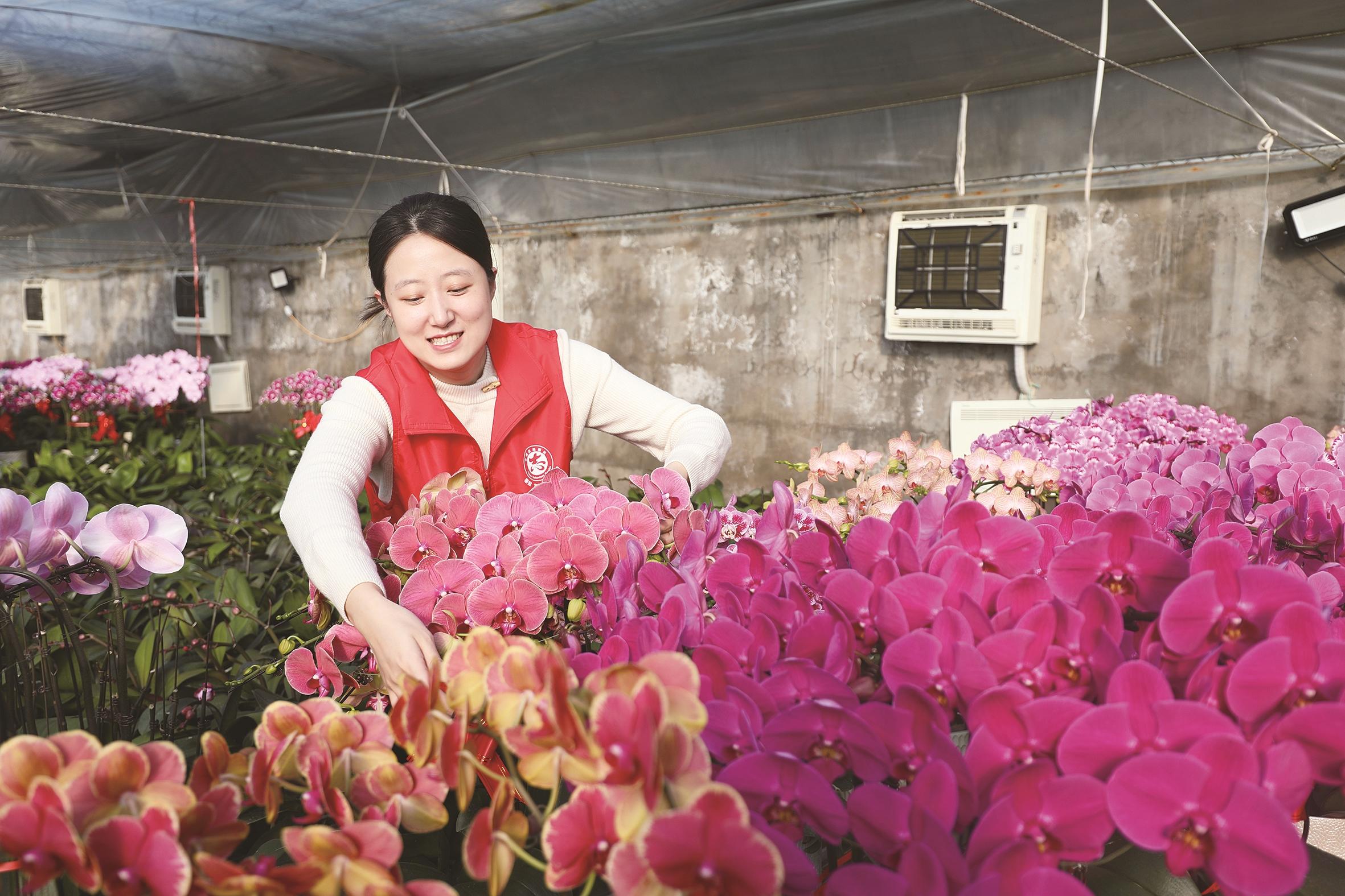 图为丰润区委社会工作部年轻干部在任各庄镇光新庄子村帮助种植户管护花卉。
