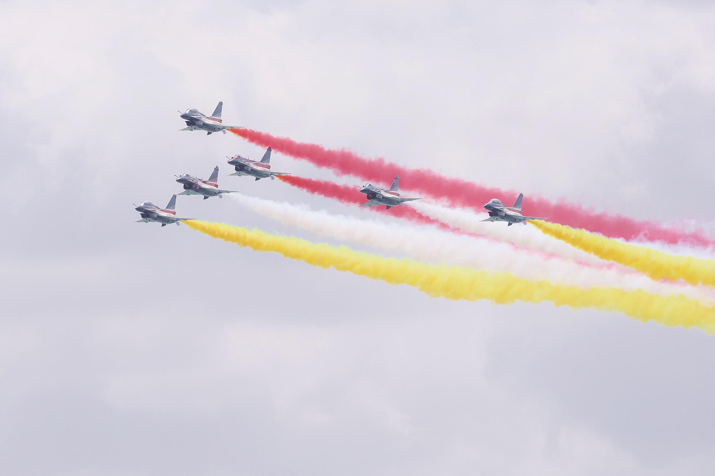 1月30日上午,中国空军八一飞行表演队在新加坡樟宜机场海面上空展开空中特技动作飞行。