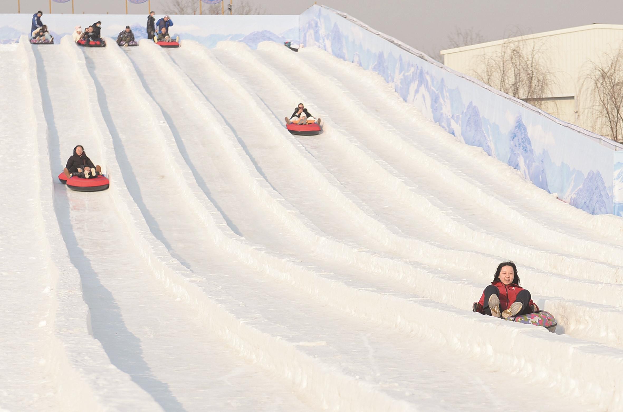 图为游客在唐山皮影主题乐园冰雪欢乐季体验130米雪滑梯项目。