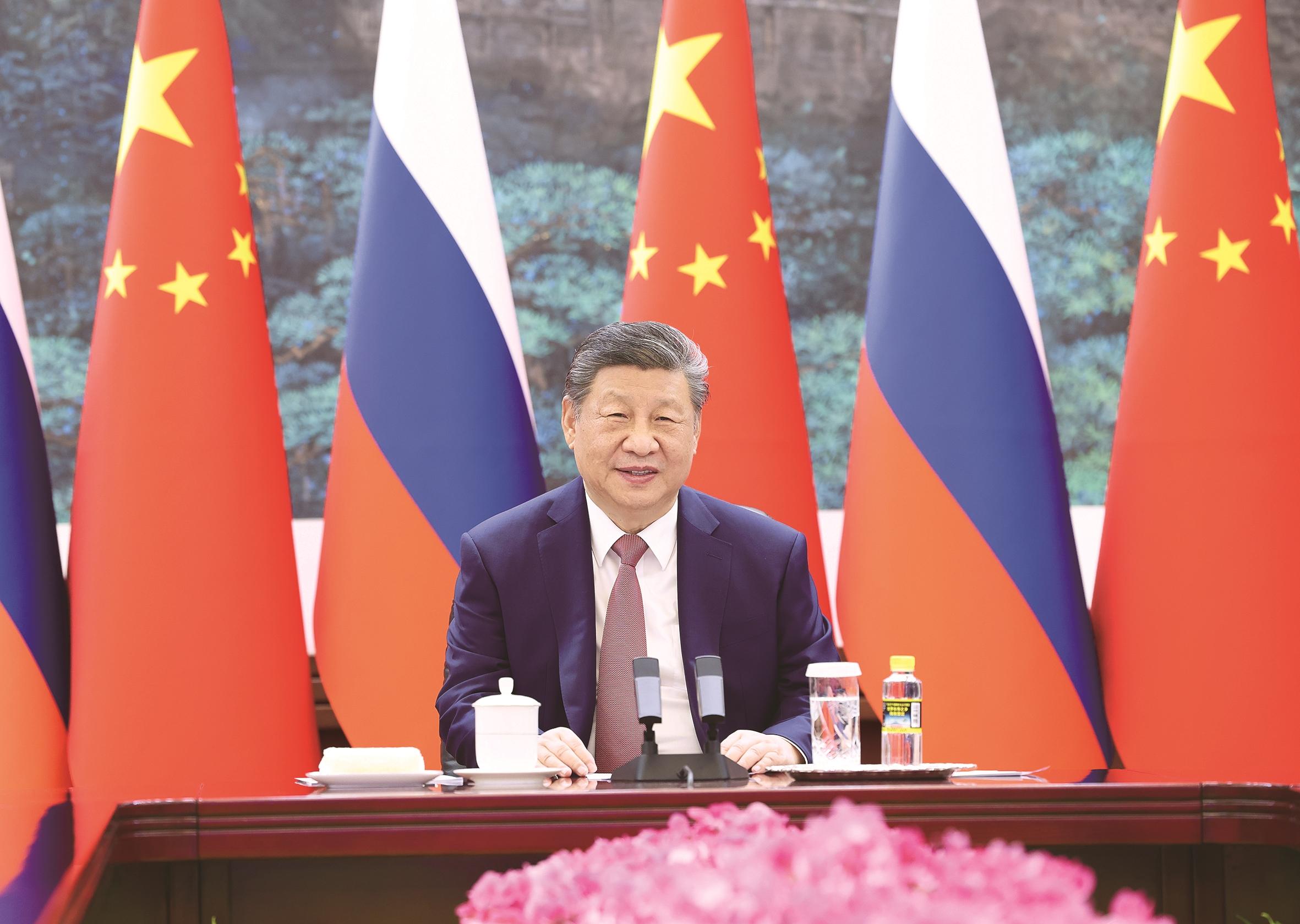 习近平表示,开年以来,国际形势愈发动荡。作为负责任大国和联合国安理会常任理事国,中俄两国有义务推动国际社会坚守公平正义,坚定捍卫二战胜利成果,坚决维护以联合国为核心的国际体系和国际法基本准则,携手维护全球战略稳定。