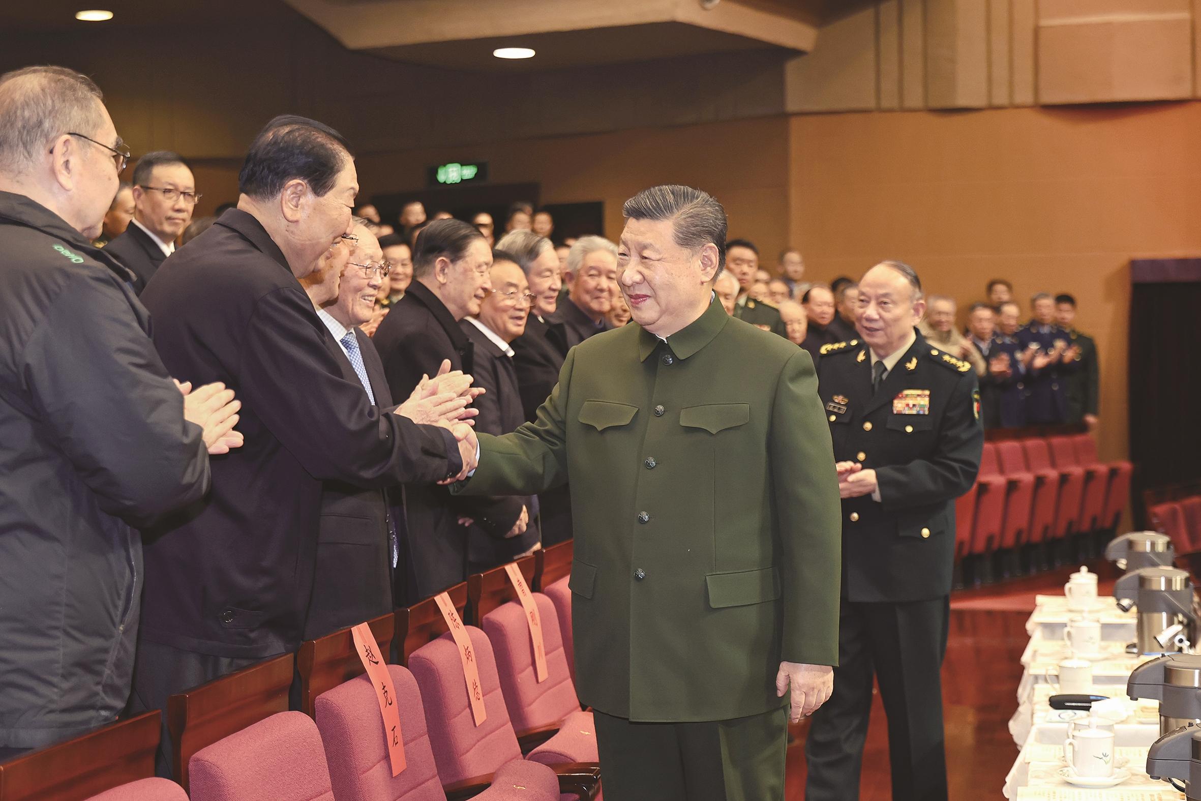 下午4时许,习近平来到老同志中间,全场响起热烈掌声。习近平同大家亲切交流、互致问候,关切询问他们的身体和生活情况,共同回顾过去一年党、国家和军队事业走过的不平凡历程、取得的重大成就。老同志们一致表示,要更加紧密地团结在以习近平同志为核心的党中央周围,坚持以习近平新时代中国特色社会主义思想为指导,深入贯彻习近平强军思想,深刻领悟“两个确立”的决定性意义,坚决做到“两个维护”,贯彻军委主席负责制,弘扬光荣传统、永葆政治本色,坚定信念、勇毅前行,为如期实现建军一百年奋斗目标、高质量推进国防和军队现代化作贡献。