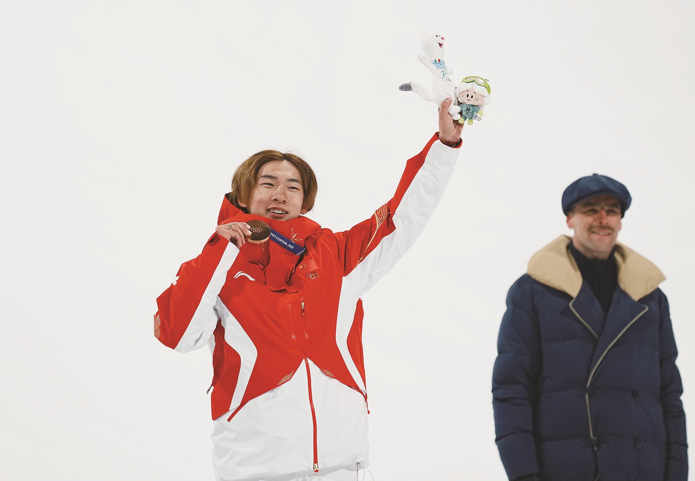 2月7日,季军中国选手苏翊鸣在颁奖仪式上。