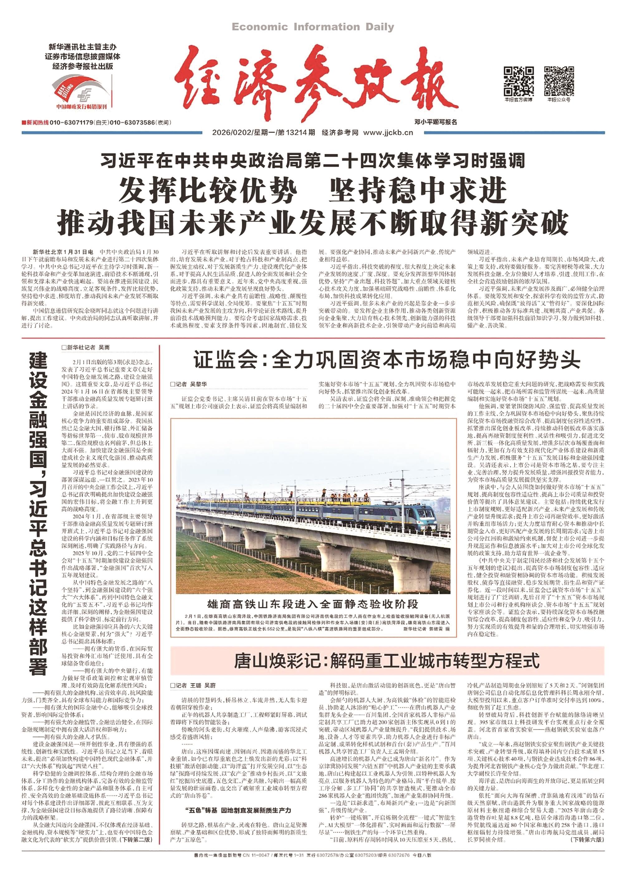 2月2日至2月8日,《人民日报》、新华社、中央广播电视总台等中央主要新闻媒体共刊发(播)唐山重点稿件23篇(条)。2月2日,《经济参考报》头版刊发《唐山焕彩记:解码重工业城市转型方程式》,以生动细腻笔触描绘了唐山这座因煤而建、因钢而兴、因港而盛的华北工业重镇,以“科技银”激活创新动能、以“海洋蓝”打开发展空间、以“生态绿”探路可持续发展、以“农产金”推动乡村振兴、以“文旅红”挖掘历史底蕴,五色交汇,产业共融,勾勒出一幅高质量发展的壮丽画卷,也交出了破解重工业城市转型方程式的“唐山答卷”。2月5日,央视《焦点访谈》播出《稳中求进起好步 因地制宜谋发展》,聚焦地方两会,其中对我市进行了报道。我市作为京津冀协同发展“六链五群”中机器人产业链发展的主要承载地,今年将加快推动科技创新和产业创新深度融合,持续聚焦机器人等战略性新兴产业,深化“京津研发、河北转化”模式,真正把区域协同优势转化为产业发展竞争力。