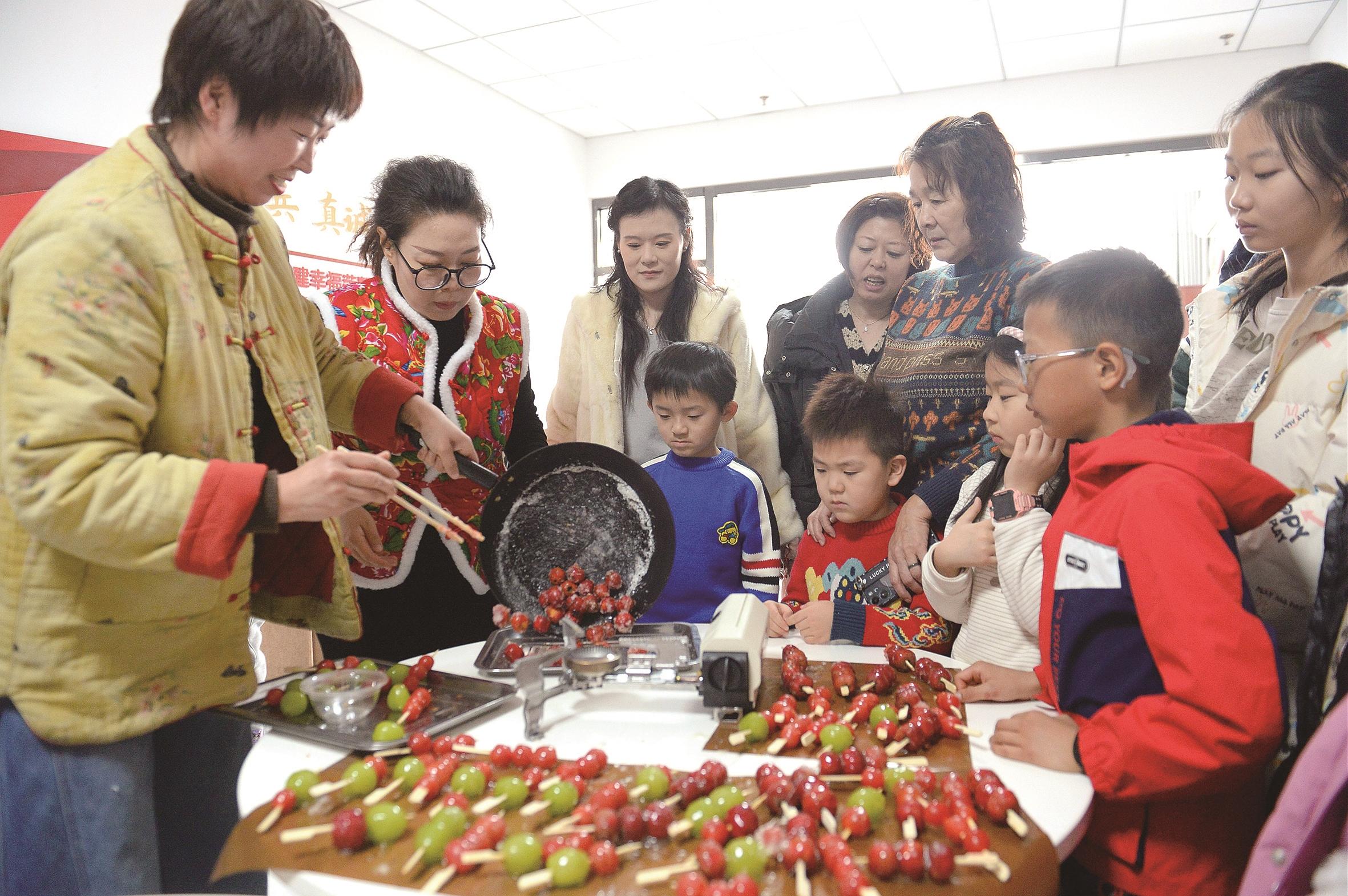 图为居民们现场体验糖葫芦制作的乐趣。杜雯拓 摄