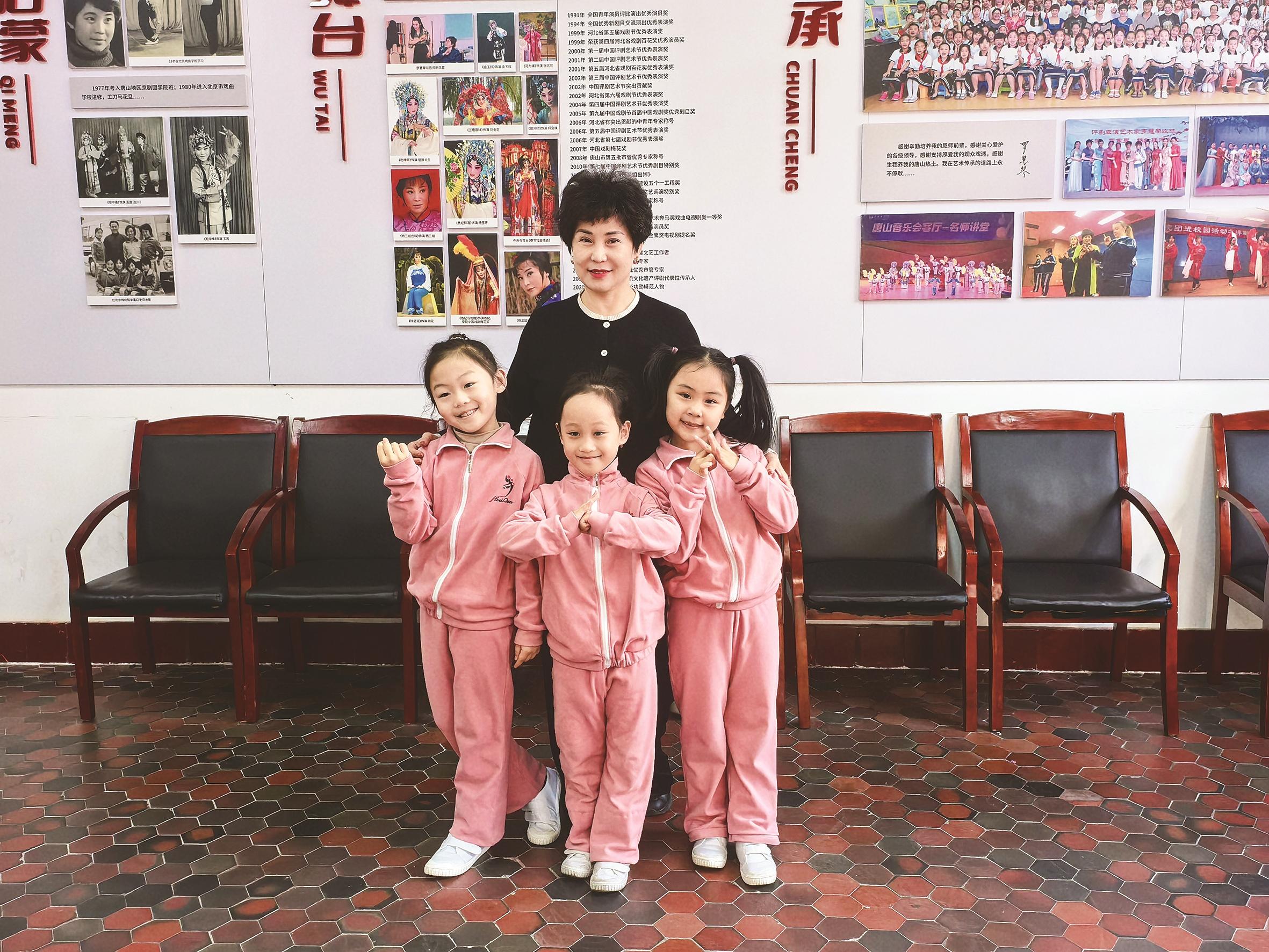 图为罗慧琴与3位评剧娃娃合影——田牧(左、7岁)、夏岩溪(中、6岁)、曾瑾辰(右、7岁)。 罗慧琴 提供