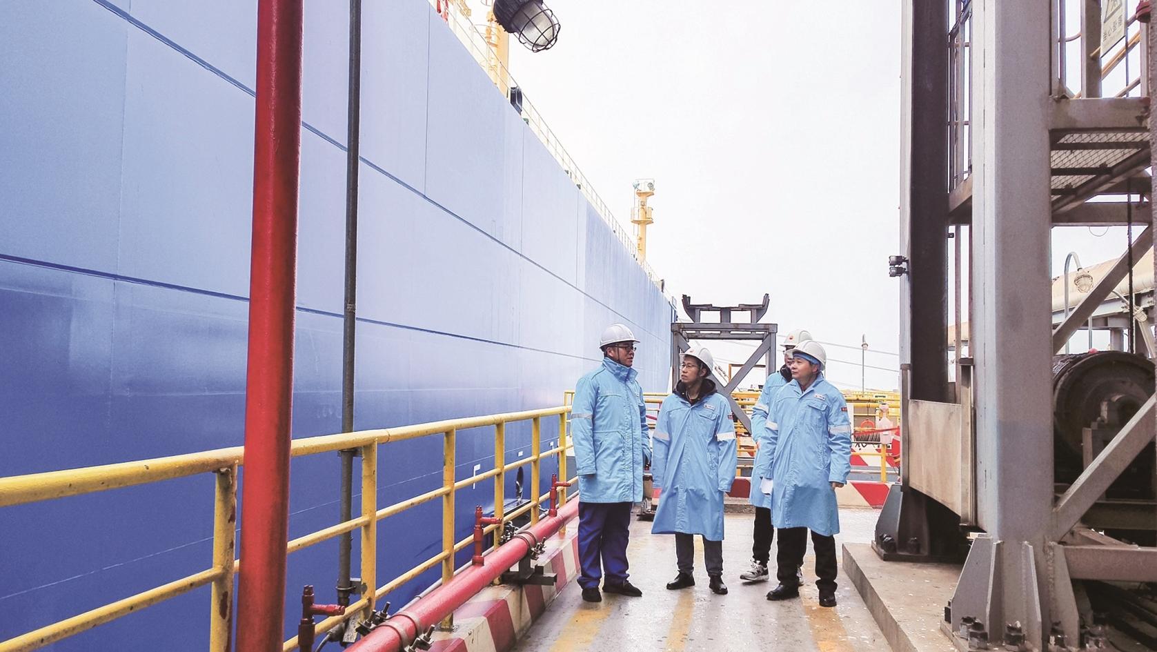 今年初,强风裹挟寒潮突袭港区,瞬时风速一度逼近作业临界值。随着每天外输气量的增加,急需运输船靠泊补给,补给刻不容缓。
