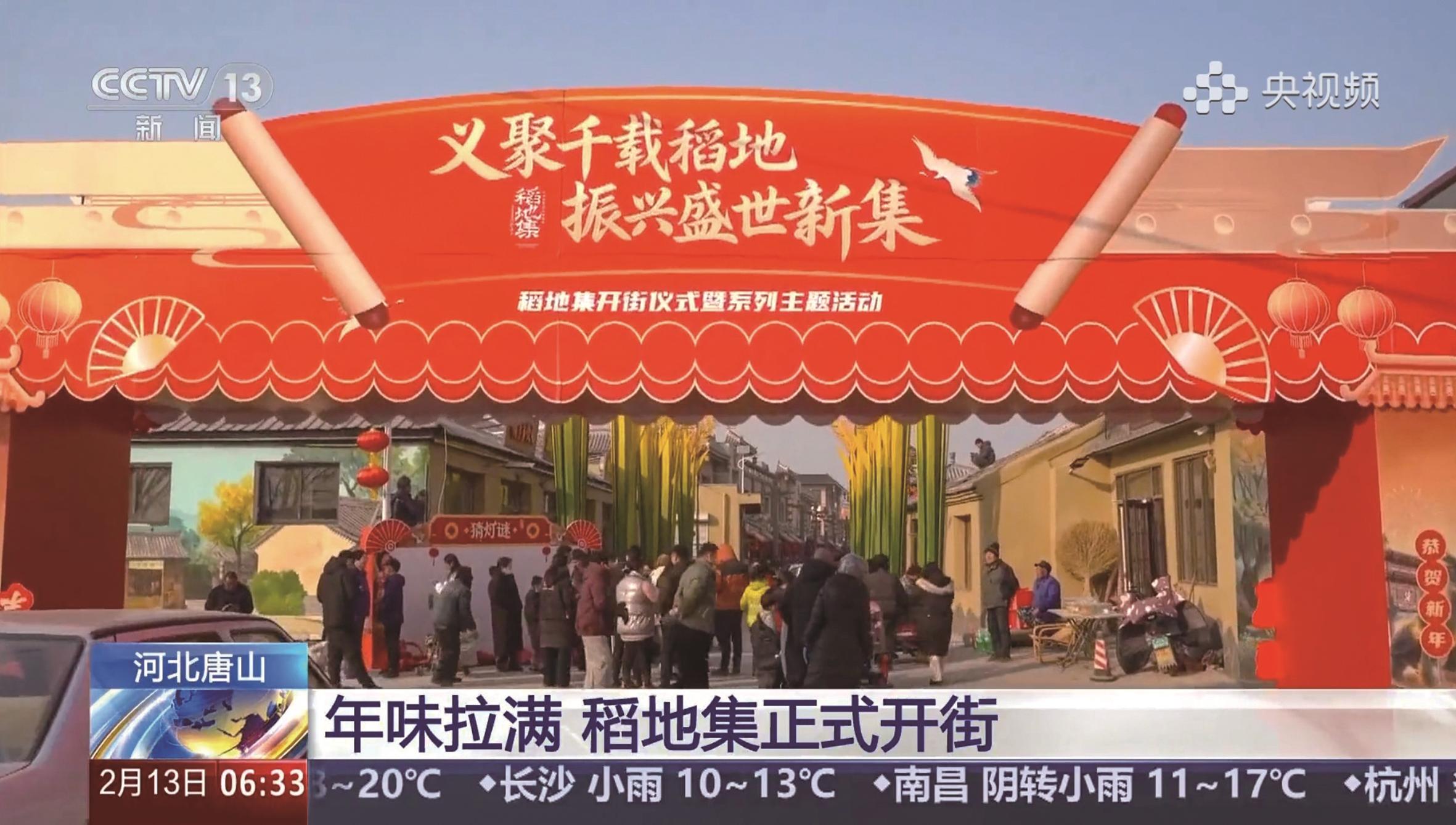 2月13日,央视《朝闻天下》播出《年味拉满 稻地集正式开街》。2月10日农历小年,在河北唐山的稻地集上,本地红薯、双黄蛋、萝卜糖等产品受到消费者的青睐。“三蹦子市集”排满了用三轮车改造的年货摊位。逛街看民俗表演,还有人型机器人挥毫书写“福”字,吸引游客纷纷驻足。