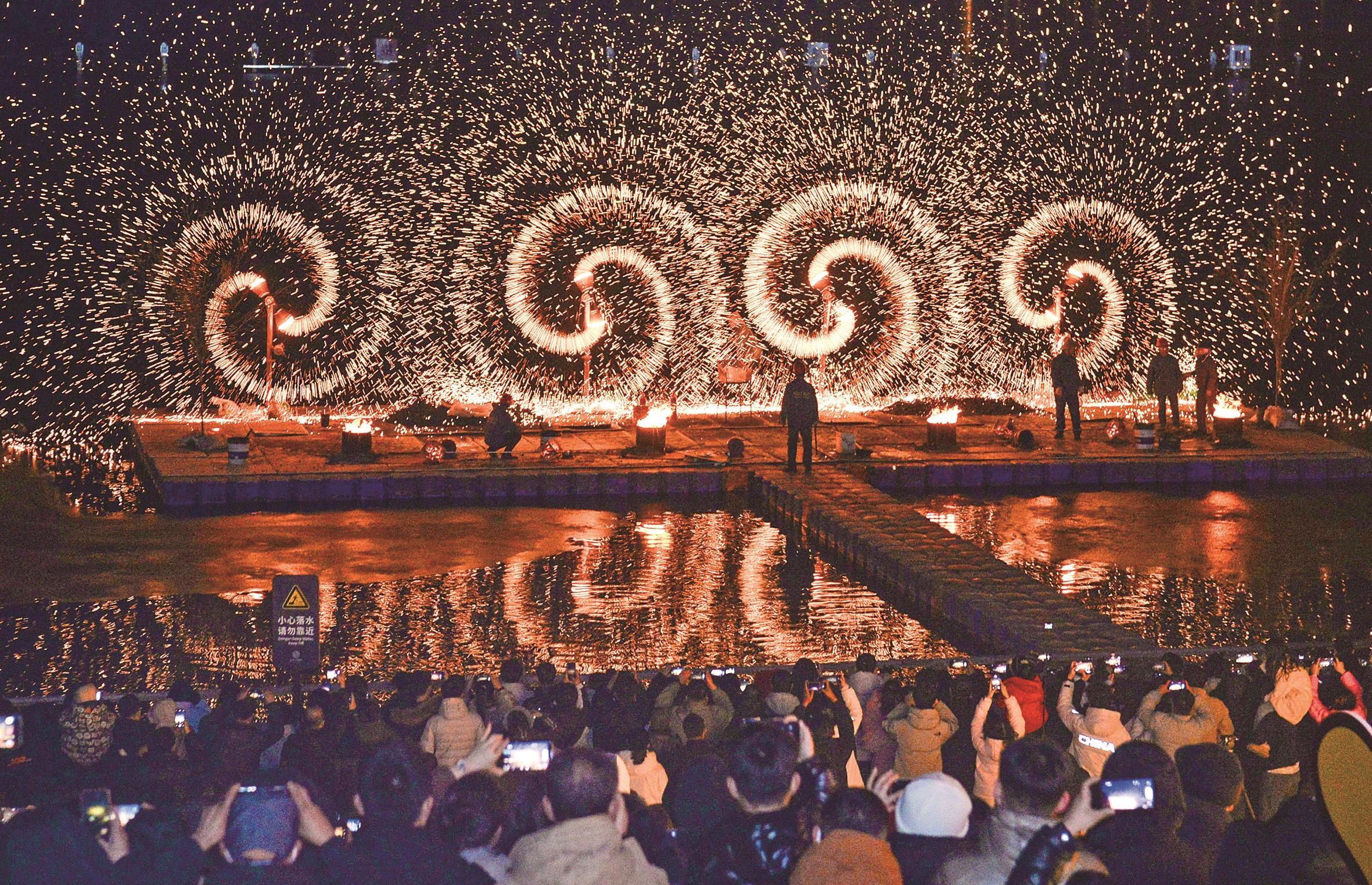 图为游客现场观看打铁花。