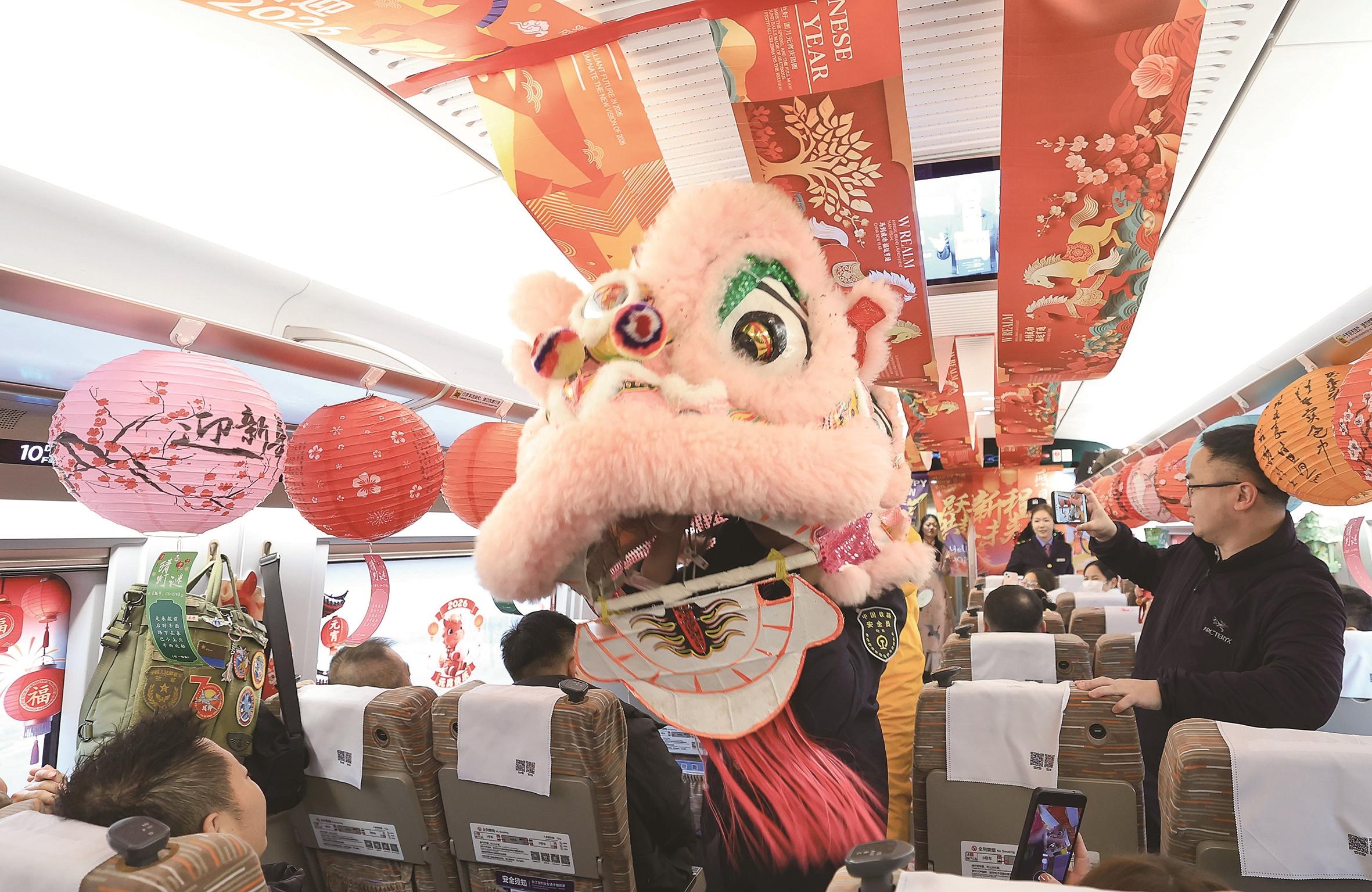 3月1日,列车工作人员在G1280次列车上表演舞狮。