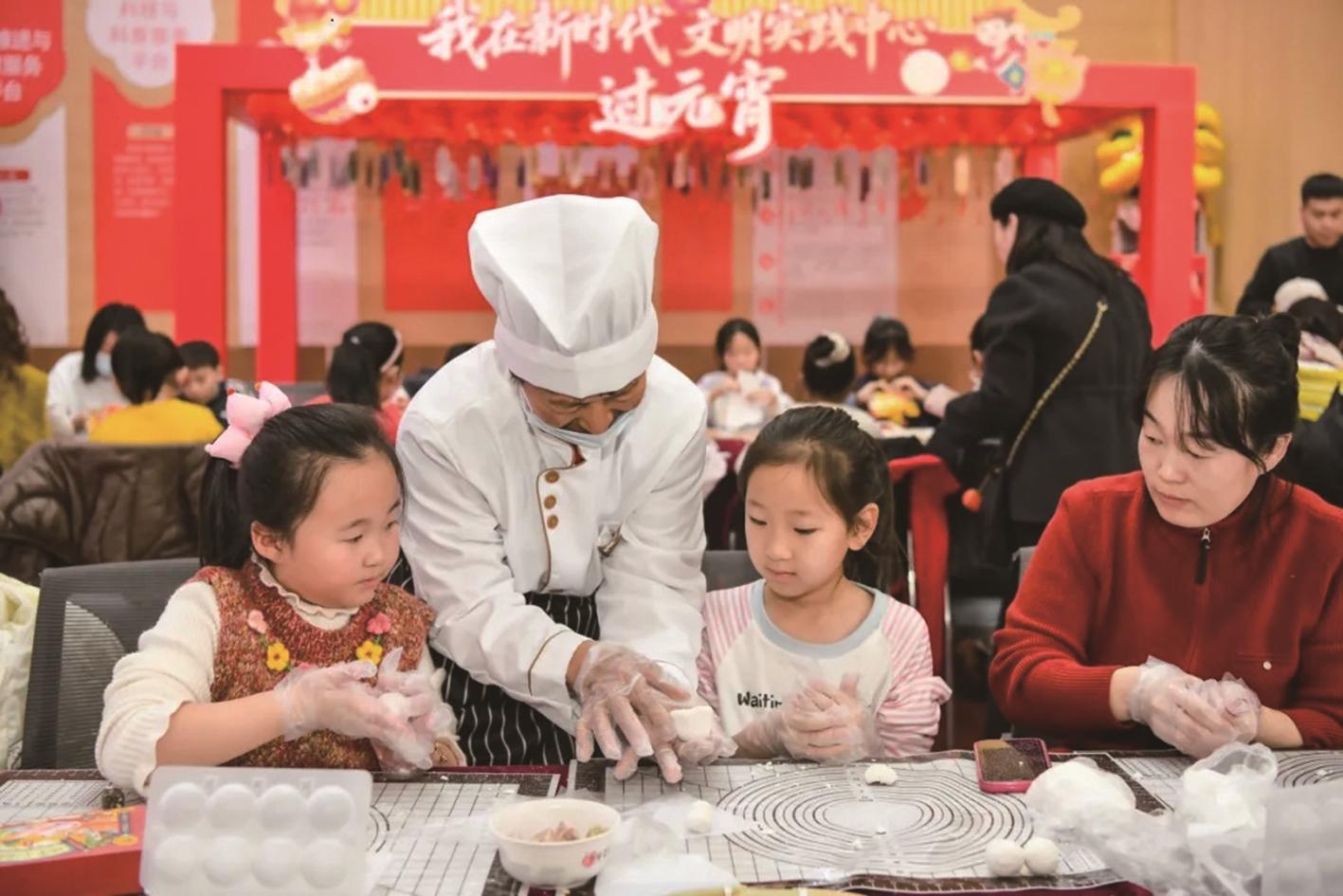 演出结束后,民俗体验区热闹起来。在巧手做花灯区域,大家围坐一起折剪粘贴,不一会儿,一盏盏马年生肖花灯陆续亮起。欢乐包元宵区域,大家边学边做,边包边聊,其乐融融。“好多年没自己包过元宵了,今天这一包,年味儿又回来了。”居民赵女士笑着说。