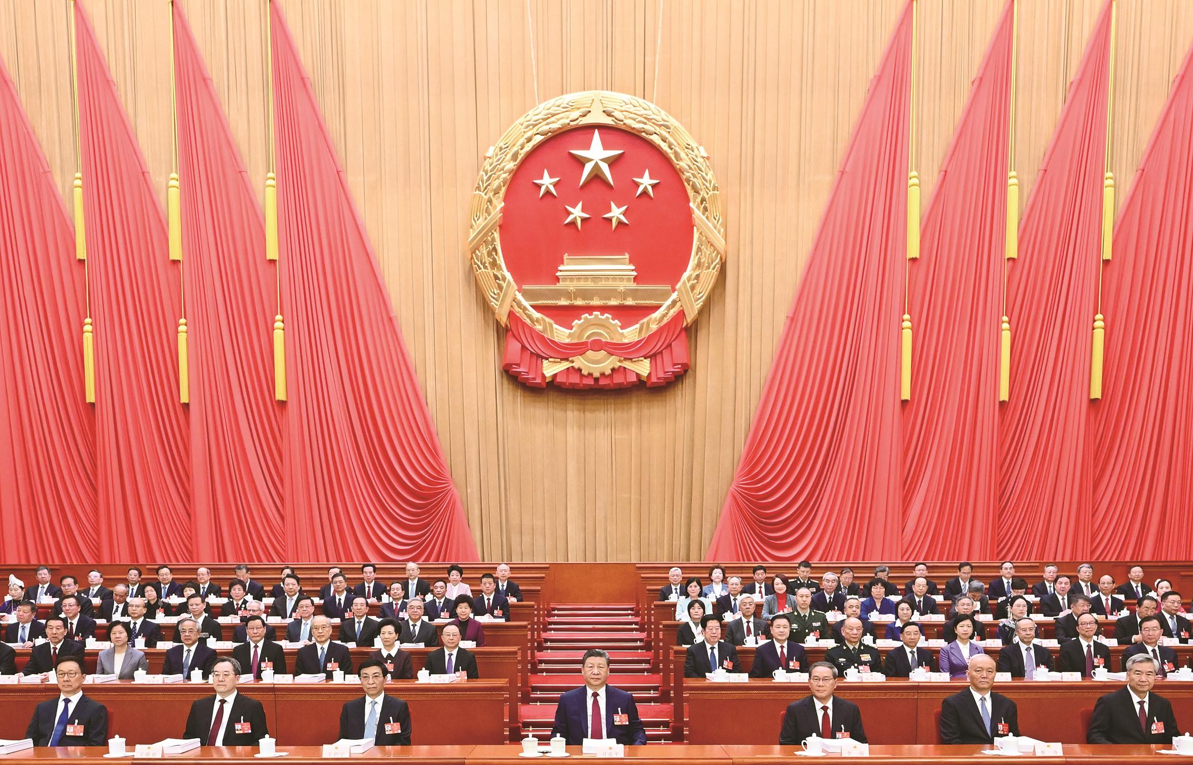 3月5日,第十四届全国人民代表大会第四次会议在北京人民大会堂开幕。党和国家领导人习近平、李强、王沪宁、蔡奇、丁薛祥、李希、韩正等出席大会。 新华社记者 谢环驰 摄