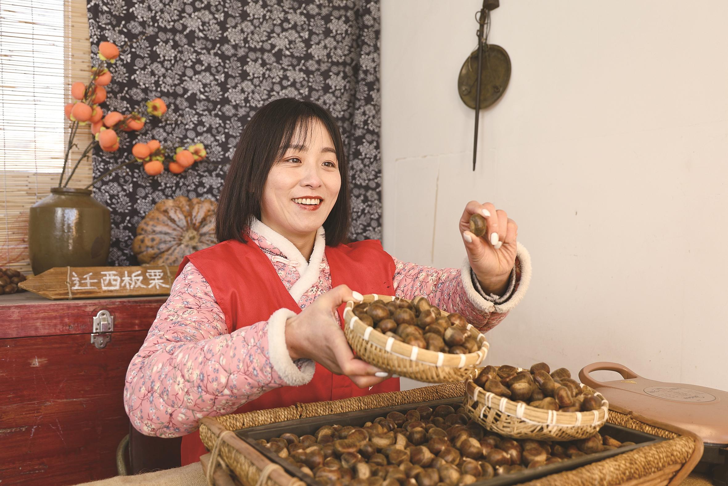 谁曾想,这位如今的带货能手,也曾为板栗销路犯愁。过去,品质优良的迁西板栗多依赖外来收购商,价格常常被压低。“咱坐拥‘中国板栗第一乡’的优质资源,为啥不能直接卖到全国?”没有专业设备,她就用手机支架搭起简易直播间;不懂运营,就报名参加镇里的电商培训班从零学起。从紧张结巴到从容互动,从寥寥数人到数十万粉丝,孙颖的直播间成了迁西板栗的“云展厅”,年销售额突破20万元。她的成功,点燃了周边青年的创业热情。