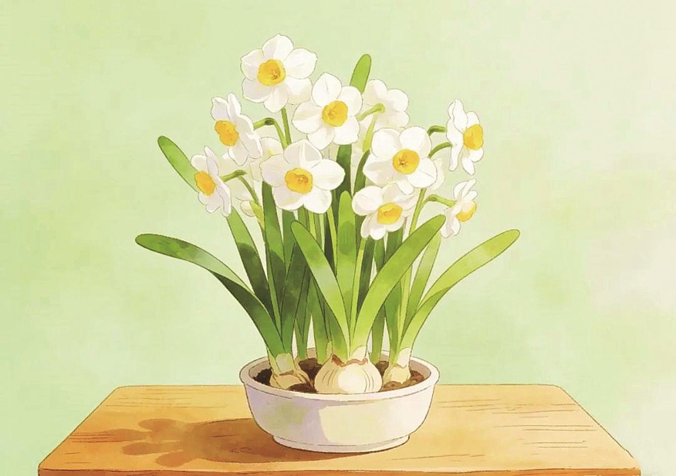 水仙好养。说好养,是对咱们这儿的气候而言。它喜欢冬天不冷、夏天不热、春秋天雨水多的地方。秋冬长叶子,早春开花,夏天就睡大觉,是个球茎。这习性,跟人躲寒暑差不多。养它,不用好土,一点清水,几颗卵石,就能活。这给它添了分仙气——喝清水就能开出香花,不是仙人手段吗?所以人又叫它“凌波仙子”,说是洛神的化身。这是文人的附会,听着好听。