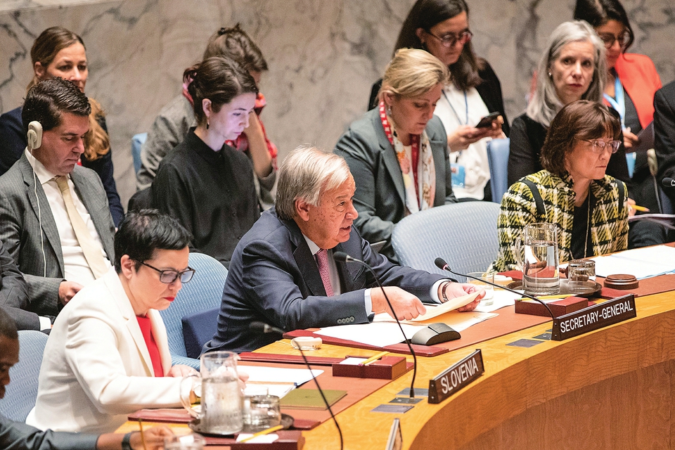 10月2日,在位于纽约的联合国总部,联合国秘书长古特雷斯(前排中)在安理会中东局势紧急会议上讲话。
