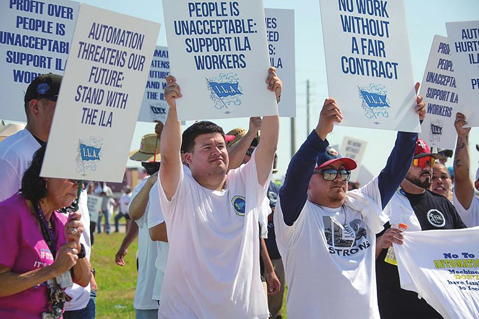 10月1日,工人在美国得克萨斯州休斯敦港举行罢工。新华社发(劳承跃摄)