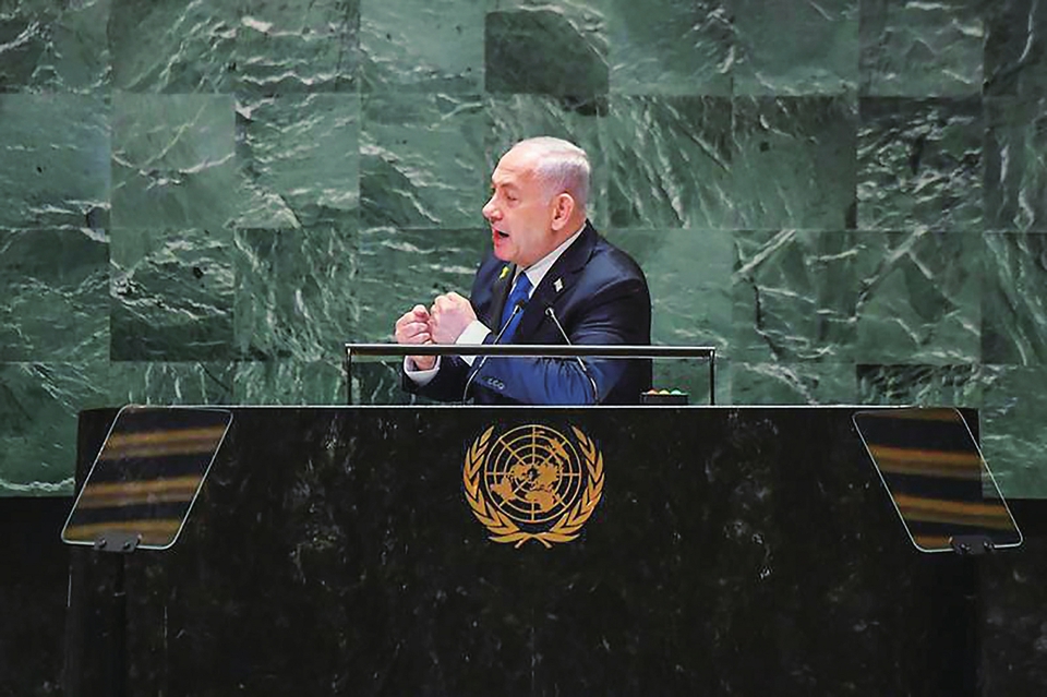 9月27日,在位于纽约的联合国总部,以色列总理内塔尼亚胡在第79届联大一般性辩论上发言时双拳敲打讲台桌面。