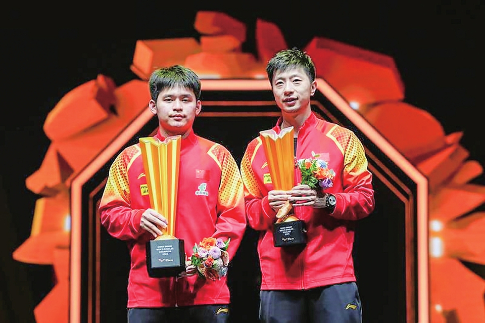 10月6日,冠军林诗栋(左)、亚军马龙在颁奖仪式上合影。 当日,在北京举行的2024年世界乒乓球职业大联盟(WTT)中国大满贯男子单打决赛中,中国选手林诗栋4比3战胜队友马龙,夺得冠军。 新华社记者鞠焕宗摄