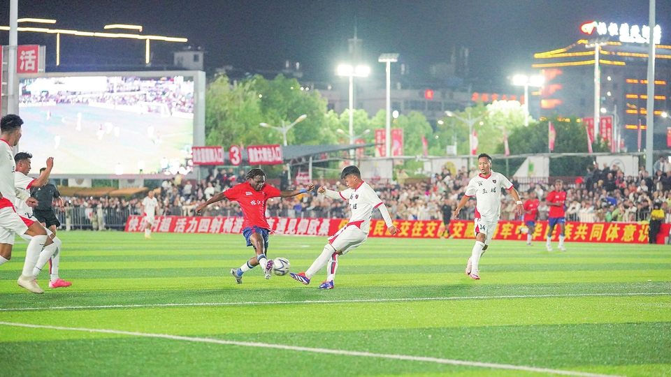 10月4日,贵州“村超”迎来一场中外友谊赛,图为青海玉树牦牛足球队和巴西圣保罗高桥足球队的球员在比赛中拼抢。