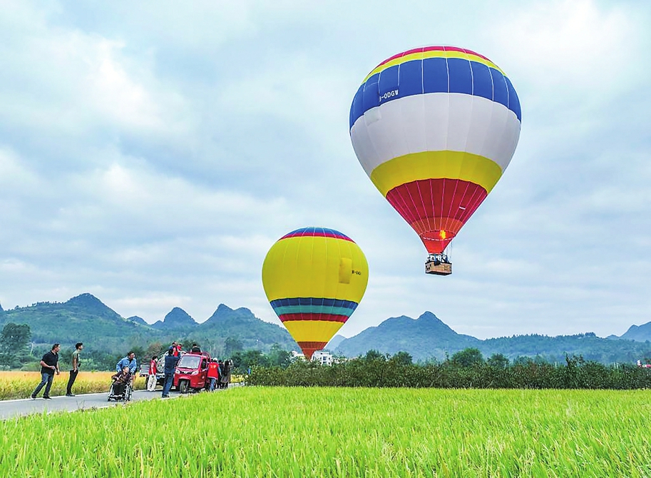 10月6日,游客在湖南省永州市宁远县湾井镇乘坐热气球,观赏田园美景(无人机照片)。不少“奔县”旅游者选择奔向县城和郊区休闲游玩,享受“慢时光”。新华社发(蒋克青摄)