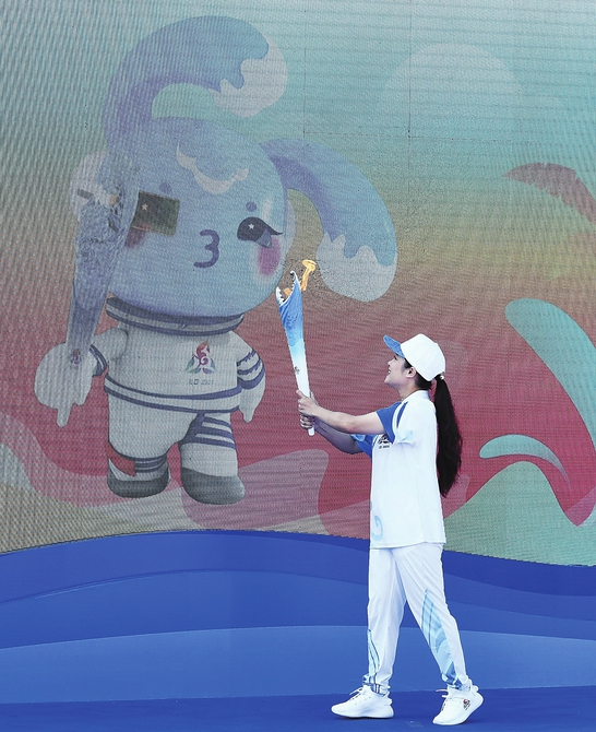 本届运动会的火炬名为“潮涌”,颜色是“大海之蓝”,造型为“潮汐起伏”,凸显“江河波涌四海同心”的理念,体现各民族齐心协力、团结共进之情感。