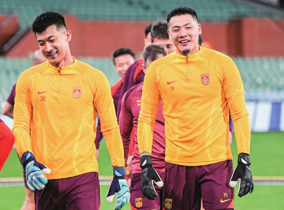 10月9日,中国队守门员王大雷(右)与刘殿座在训练中。
