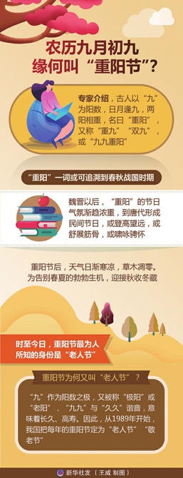 岁岁重阳,今又重阳。到底缘何叫“重阳”?历史学者、天津社会科学院研究员罗澍伟介绍,古人以“九”为阳数,日月逢九,两阳相重,名曰“重阳”,又称“重九”“双九”,或“九九重阳”。