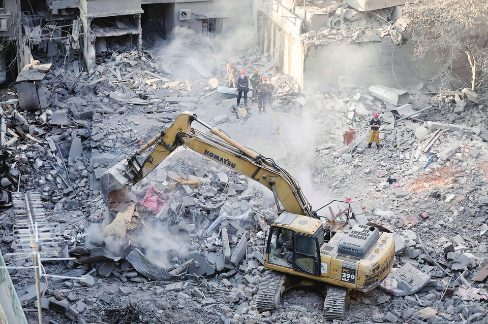 10月11日,在黎巴嫩首都贝鲁特,人们在以色列袭击现场清理废墟。新华社发(比拉尔·贾维希摄)