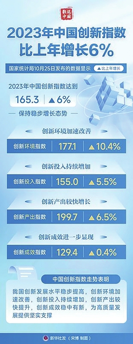新华社北京10月25日电(记者潘洁)国家统计局25日发布的数据显示,2023年中国创新指数达到165.3,比上年增长6%,保持稳步增长态势。