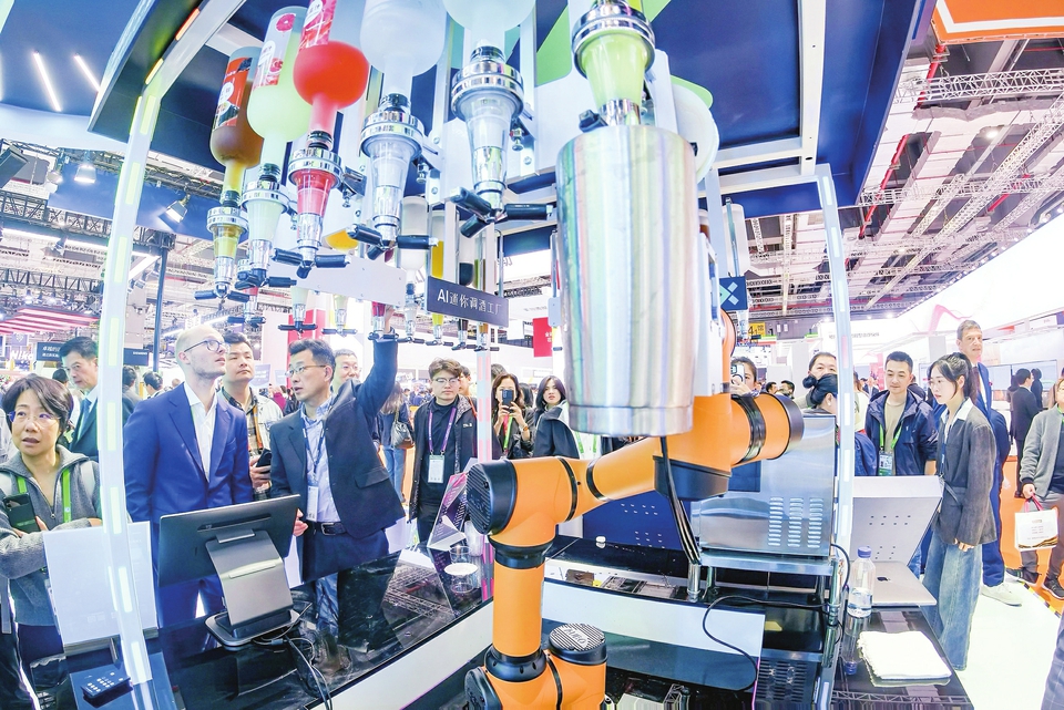 这是11月6日在第七届进博会技术装备展区西门子展台拍摄的AI迷你调酒工厂。新华社记者 张铖 摄