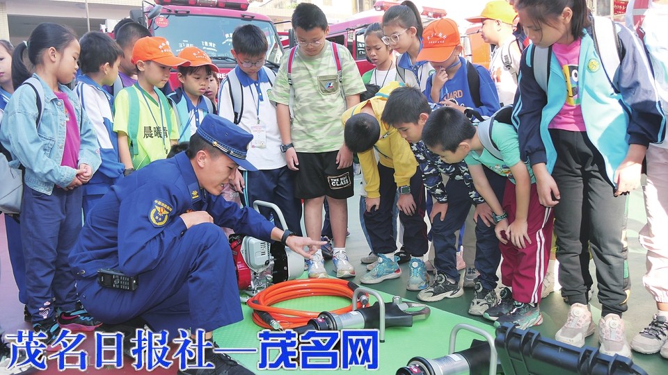 小记者认识消防器材。茂名日报社全媒体记者 吴坤成 张伟浩 摄