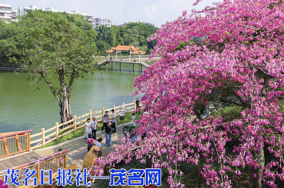 十一月的天气晴空万里,又到异木棉花开的季节,茂名各处的异木棉树相继进入花期。近日,位于市区新湖公园的西门栈桥旁边,两棵美丽异木棉树绽放登场,满树鲜花随风摇曳生姿,粉红色的花团缀满枝头、层层叠叠,初冬里,那一抹粉色浪漫的氛围直接拉满。美丽异木棉俗名美人树、美丽木棉、丝木棉,是木棉科异木棉属植物。花期为每年10至12月,冬季为盛花期,盛放时花多叶少,花大且茂,满树姹紫秀色照人,是凭颜值走红的“美人树”。在新湖公园,这两棵美丽异木棉连成一片粉色云朵,在蓝天白云下分外显眼,为公园增添了亮丽的色彩,也成为近日市民纷纷打卡的“网红树”。连日来,众多情侣、闺蜜、摄影发烧友不约而同前来,用镜头定格南国冬日的这场浪漫之约。