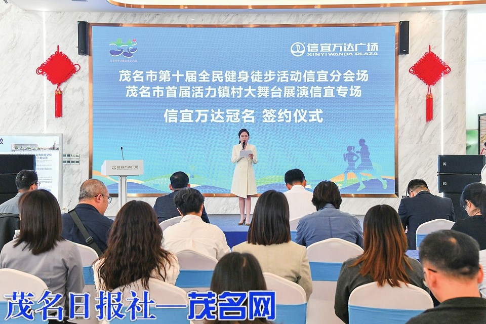 茂名晚报讯 携手共进,活力信宜再出发。11月23日上午10时,茂名市第十届全民健身徒步活动信宜分会场、茂名市首届活力镇村大舞台展演信宜专场信宜万达冠名签约仪式在信宜万达广场营销中心举行,旨在通过接下来将举办的这两场活动,激发信宜市全民健身热情,促进信宜市文化体育事业发展。