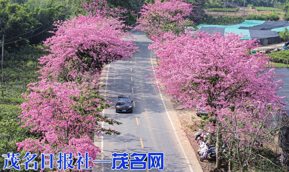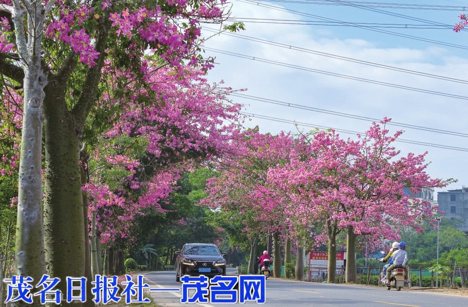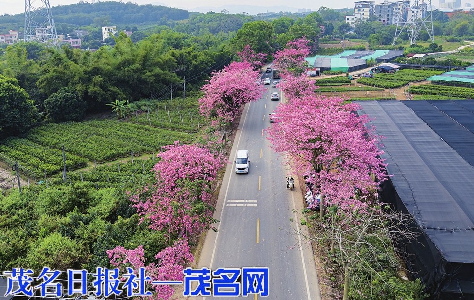 近日茂名天气持续晴好,在电白区观珠镇山美村s281公路两旁的异木棉相继盛放。鲜艳的花朵在周围绿树的衬托下异常醒目,车辆如穿梭在粉红色的隧道中。