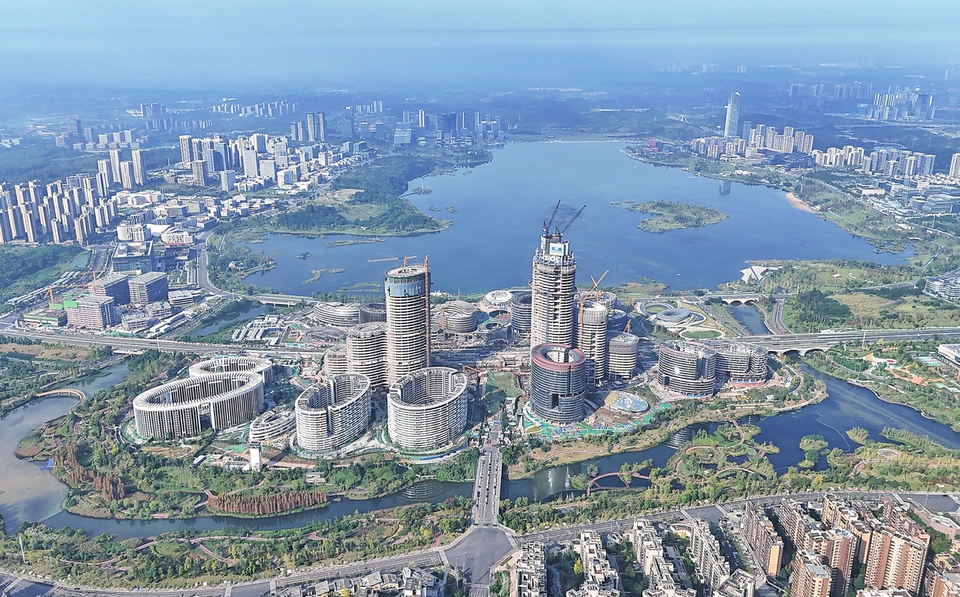 这是位于四川天府新区兴隆湖畔正在修建中的成都科创生态岛(2024 年 10月23日摄,无人机照片)。新华社记者 刘坤 摄
